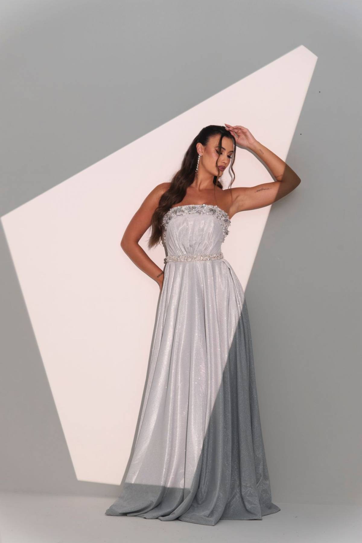 Descrição:Vestido prata, lurex com brilho, decote princesa estruturado, semi bordado, cinto com laço opcional