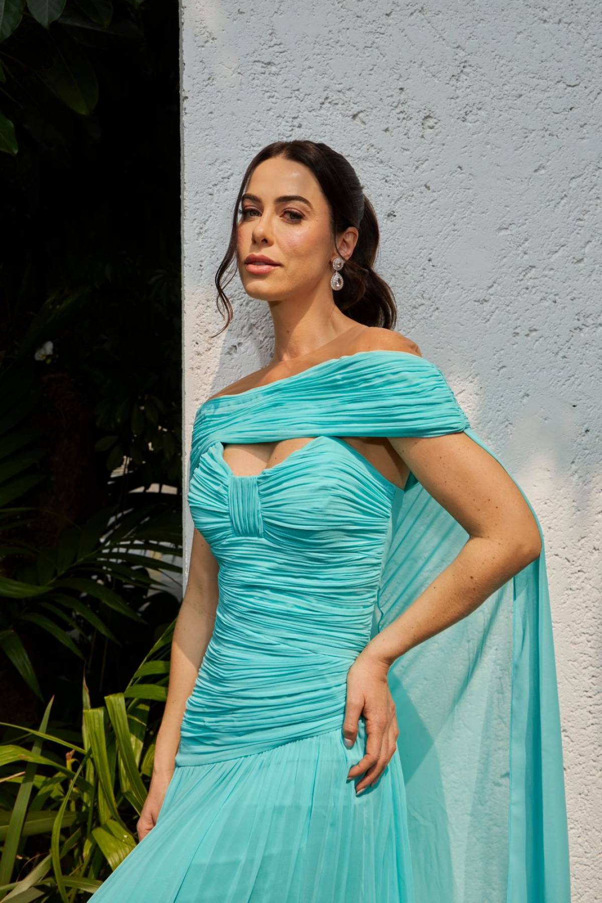 Descrição:Vestido longo liso, tiffany, inteiro de drapeado,manga capa opcional