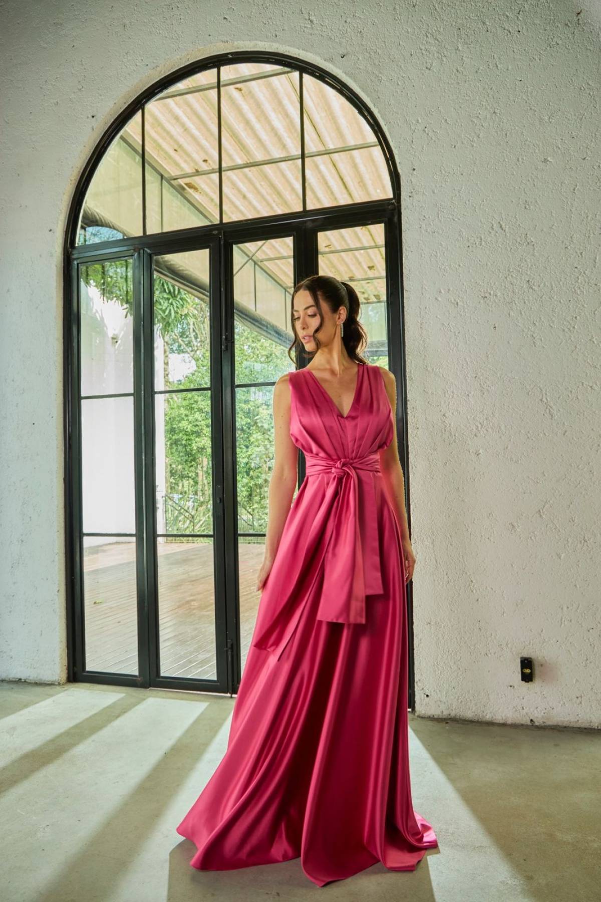 Descrição:Vestido longo pink, em alfaiataria, decote v com drapeados, nó na cintura
