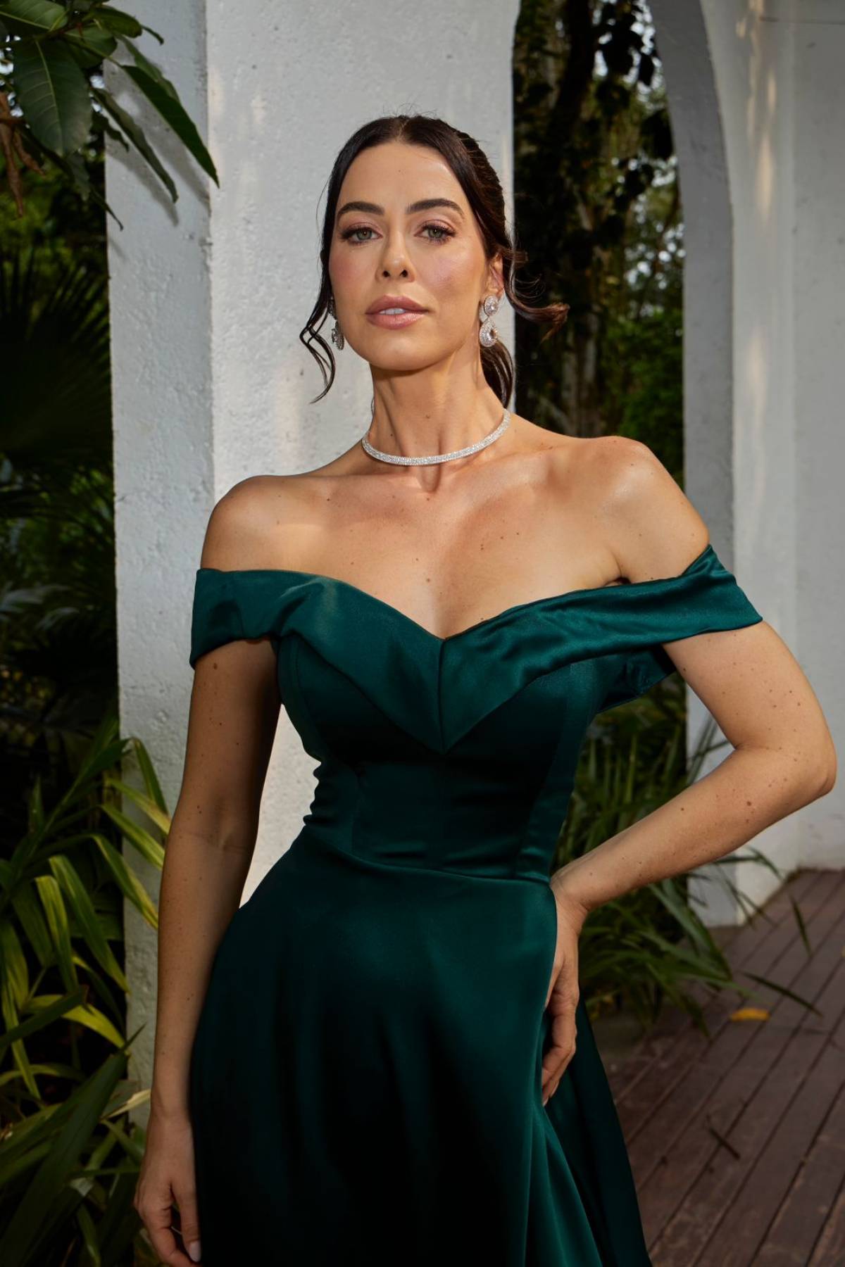 Descrição:Vestido longo, verde musgo escuro, corset ombro a ombro, fenda lateral
