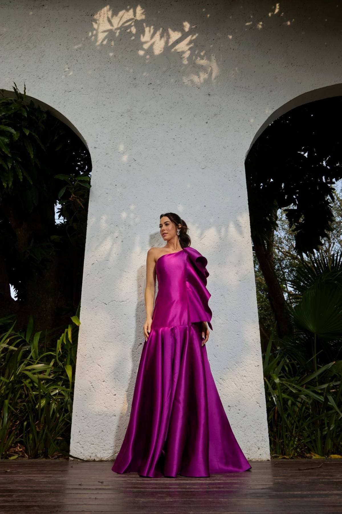 Descrição:Vestido longo liso, alfaiataria, laço no ombro, fucsia