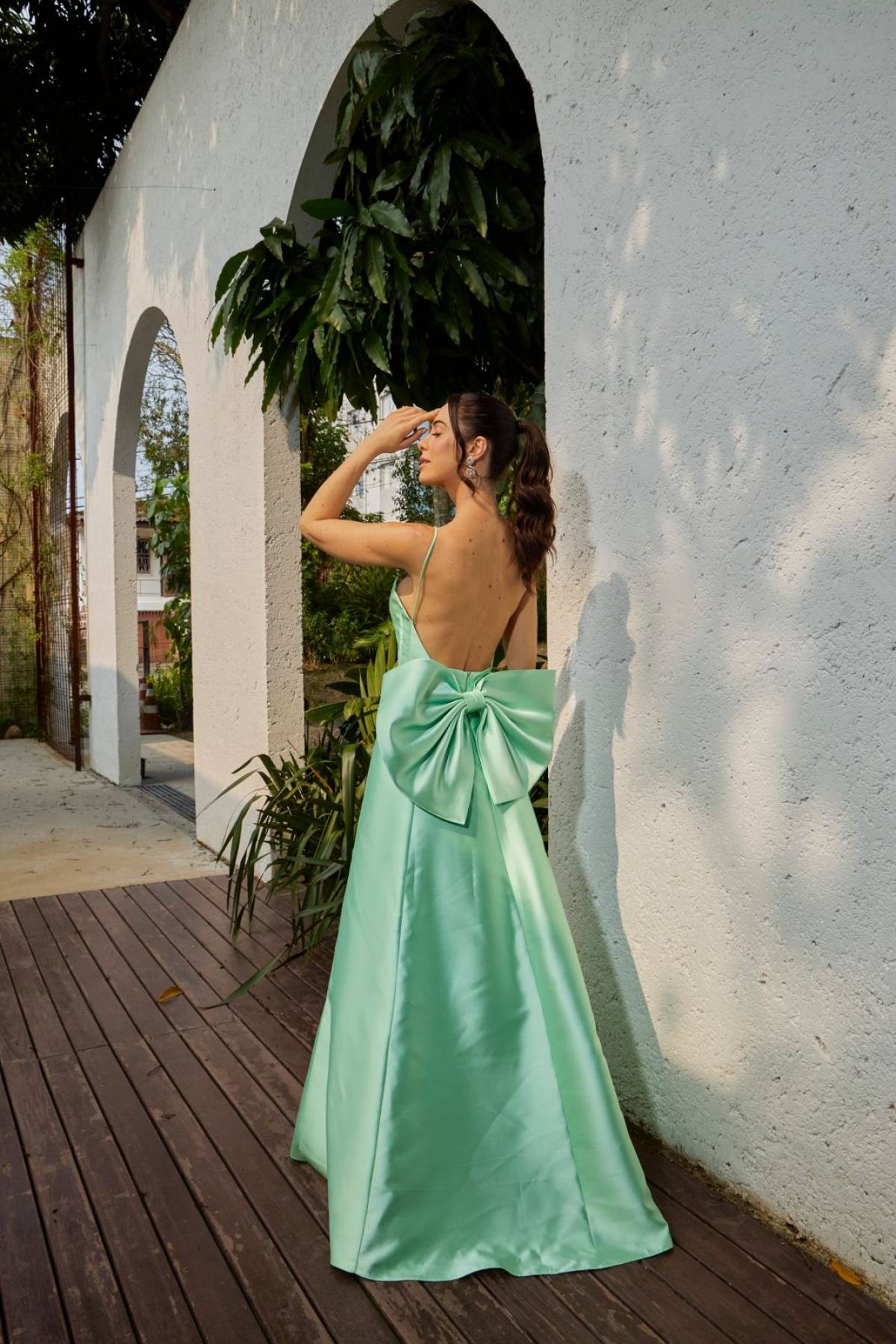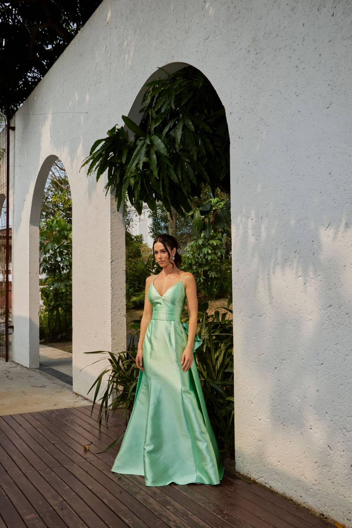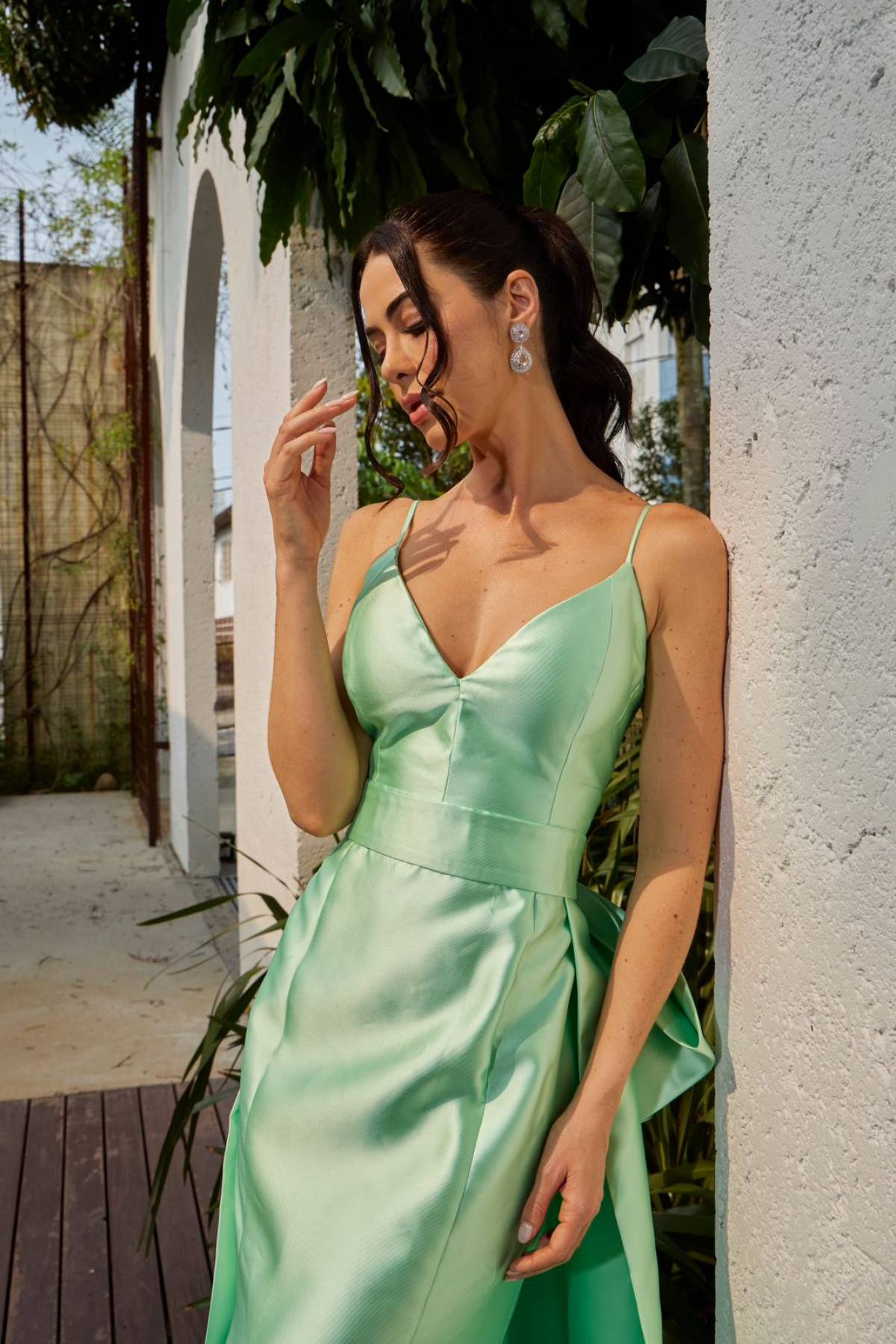 Descrição:Vestido longo verde menta liso de alça fina, semi sereia, decote V, laço nas costas opcional, costas abertas.