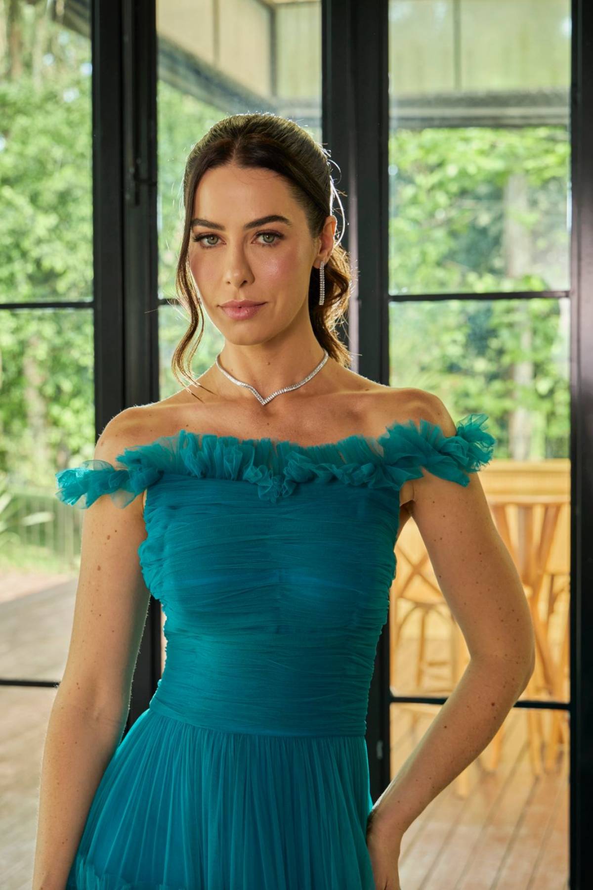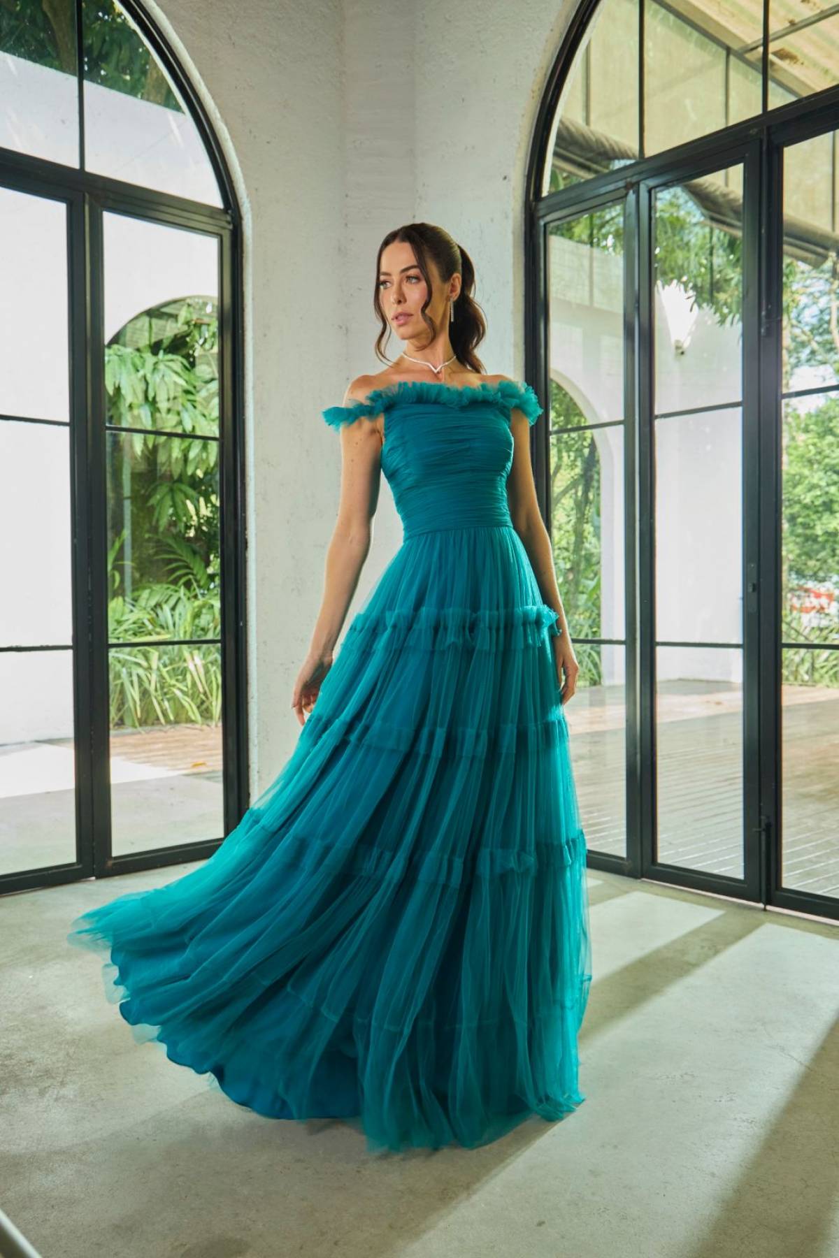 Descrição:Vestido verde petróleo de tule ombro a ombro com manga
