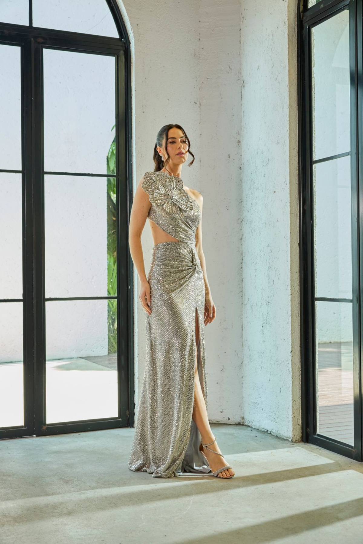 Descrição:Vestido longo prata, com recortes e assimetria, em paete, um ombro so com aplicacao de flor