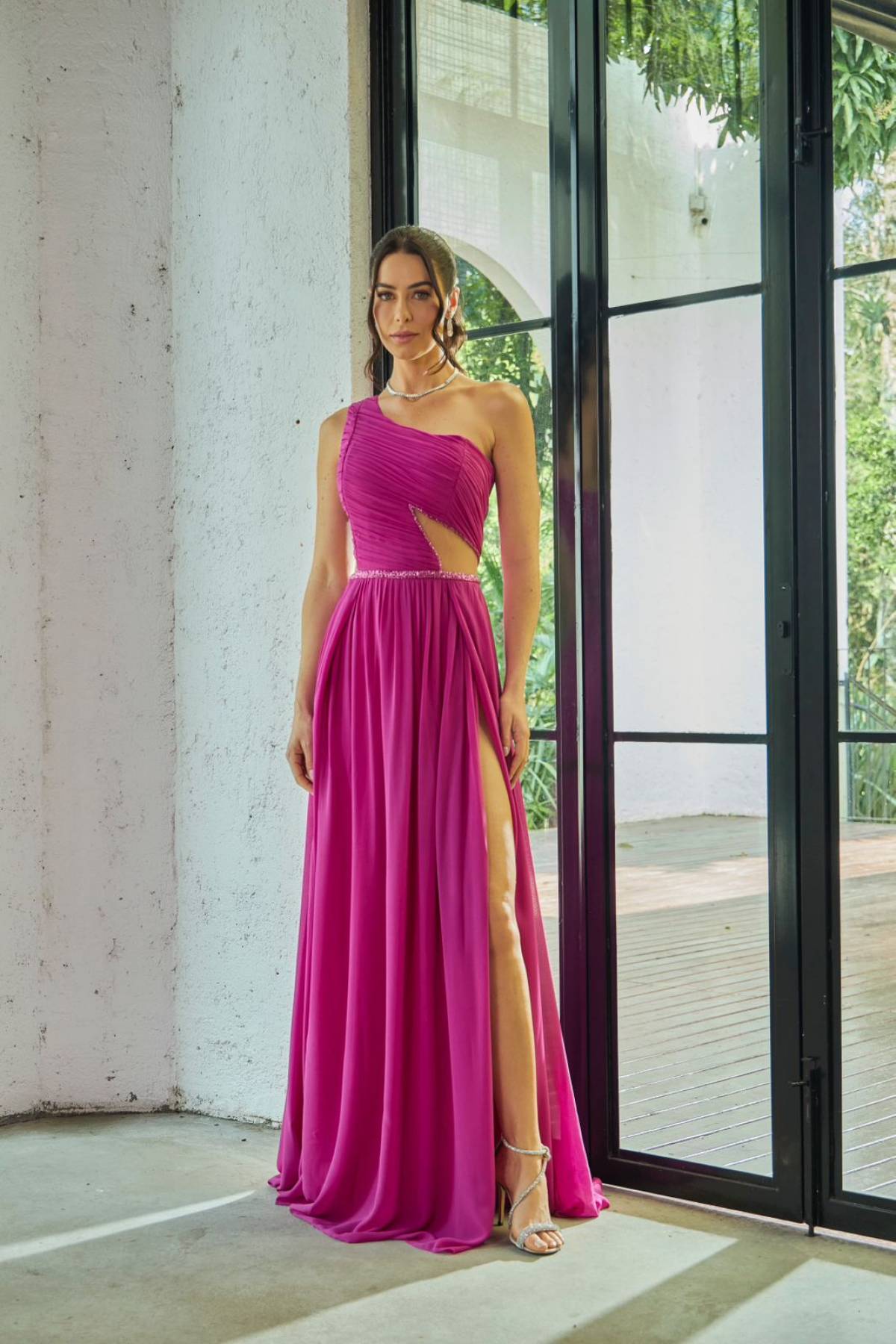 Descrição:Vestido longo pink/fucsia, inteiro liso, assimetria com um ombro só, recortes e busto drapeado