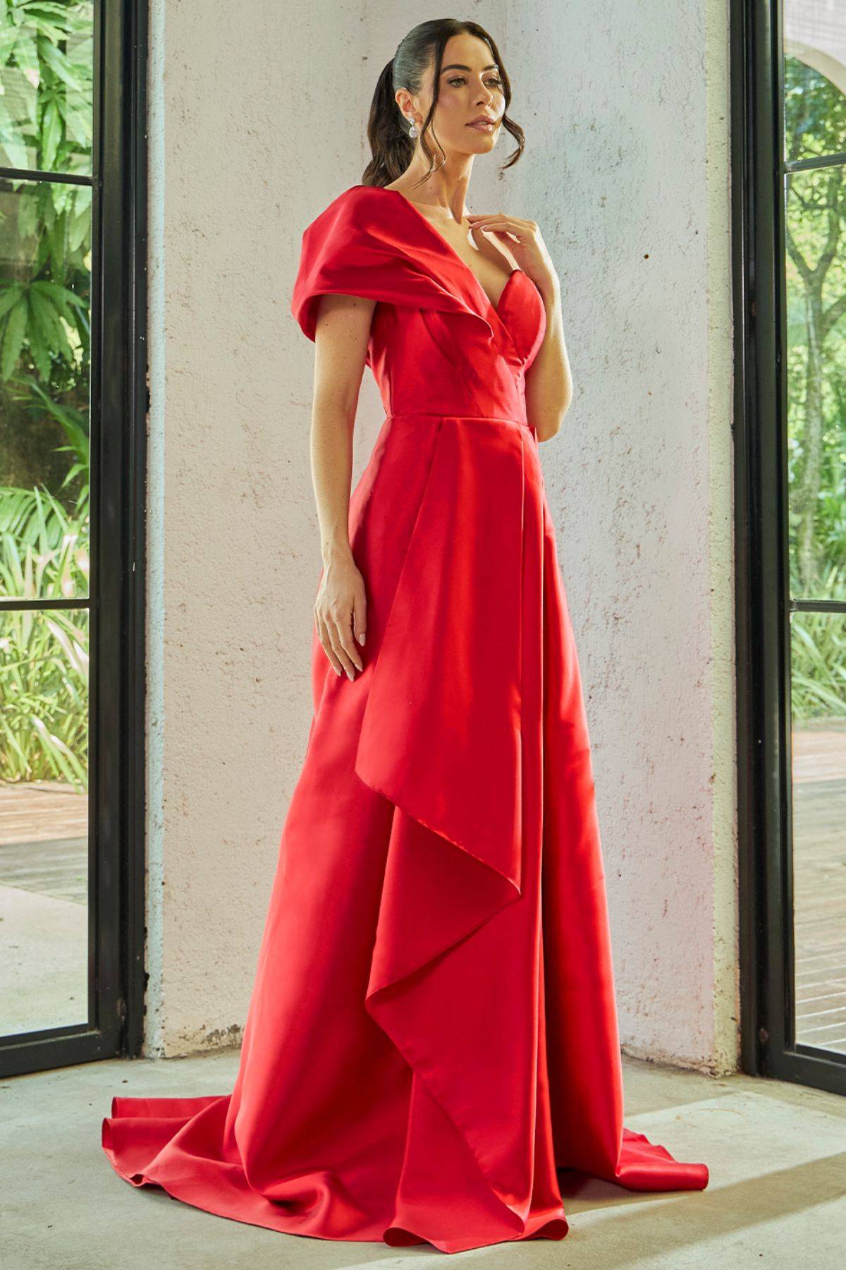 Vestido alfaiataria em zibeline vermelho, com detalhe no ombro e fenda.