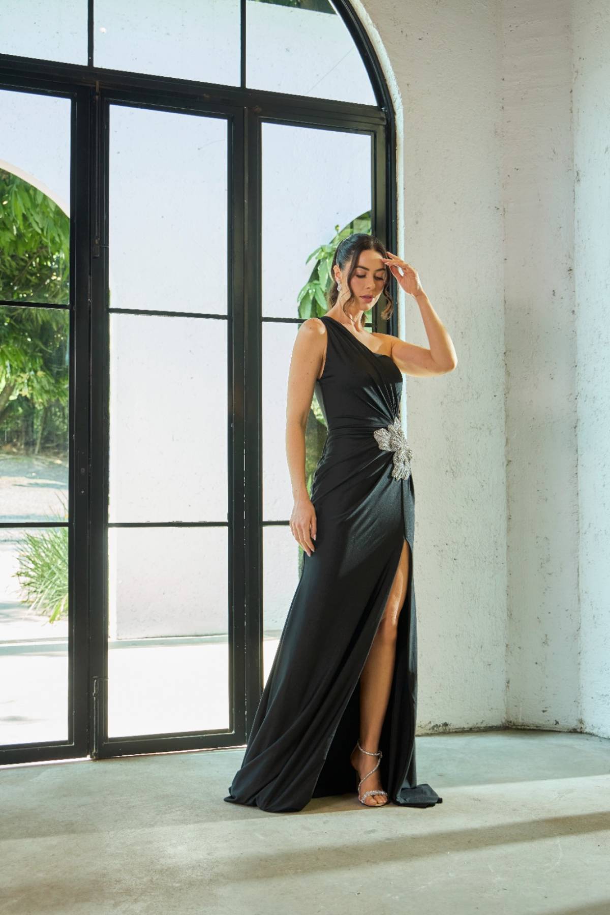 Descrição:Vestido preto de um ombro só, fenda lateral, flor de strass na cintura