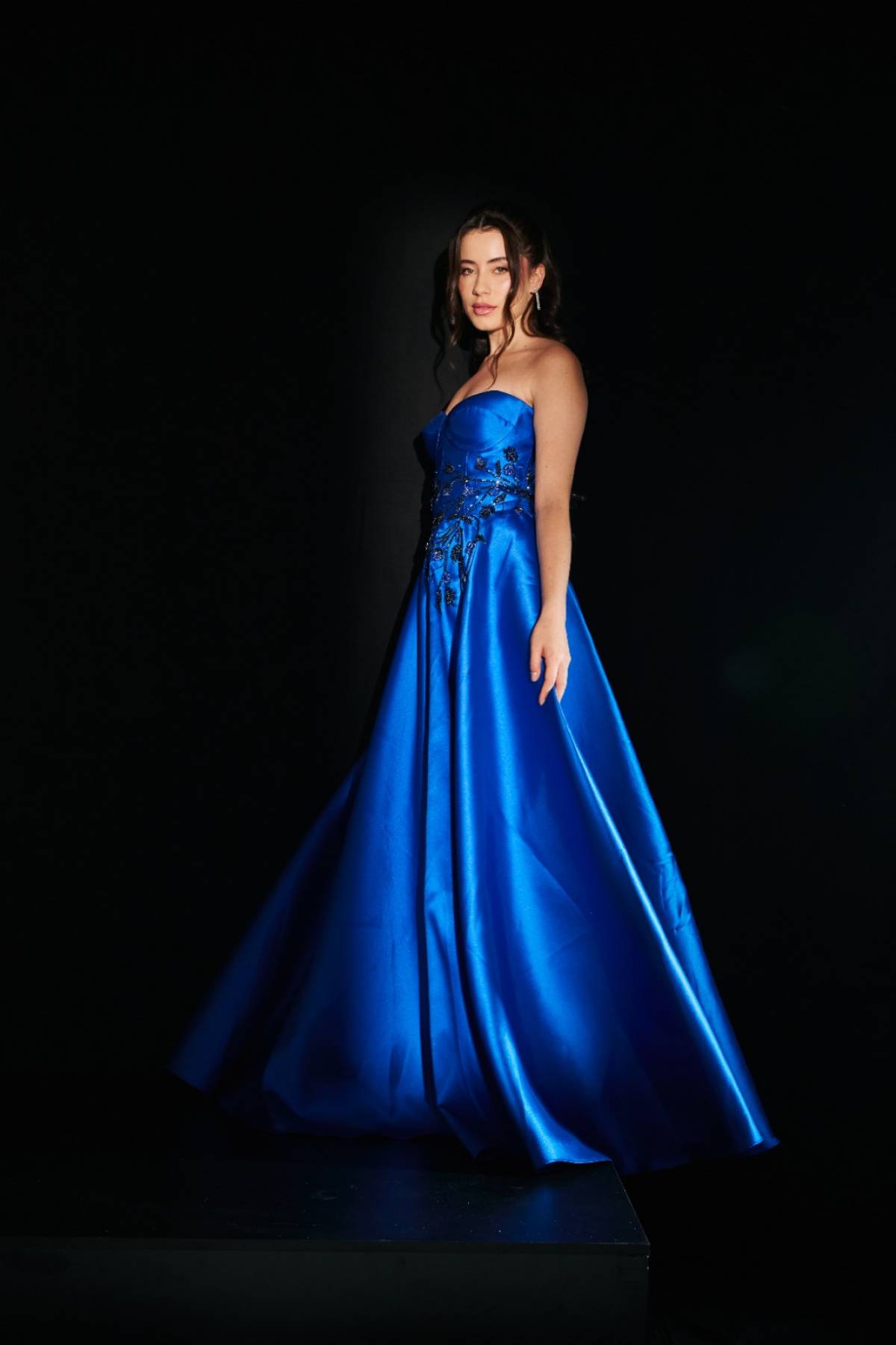 Vestido tomara que caia alfaiataria na cor azul, com bordados laterais.