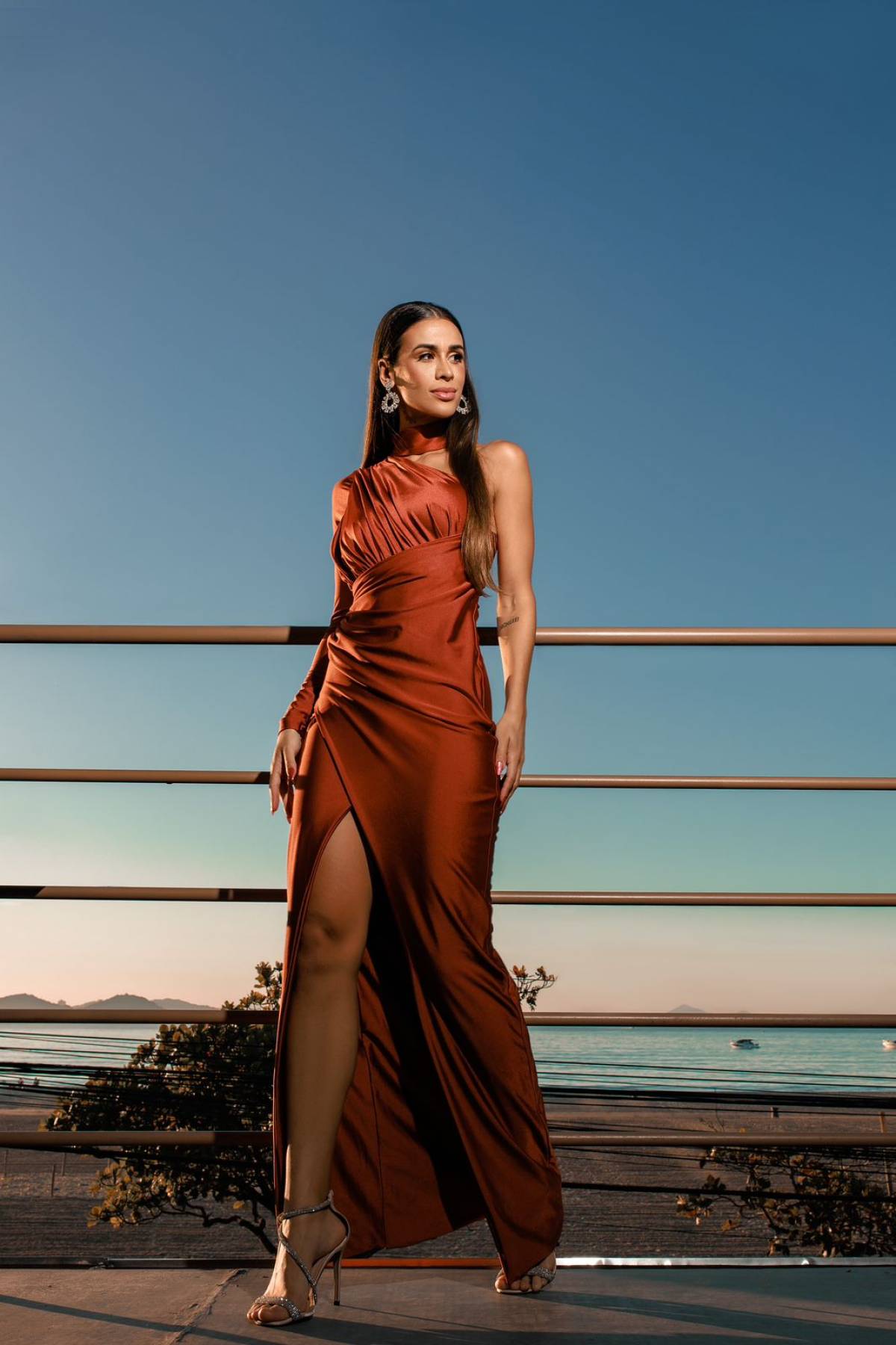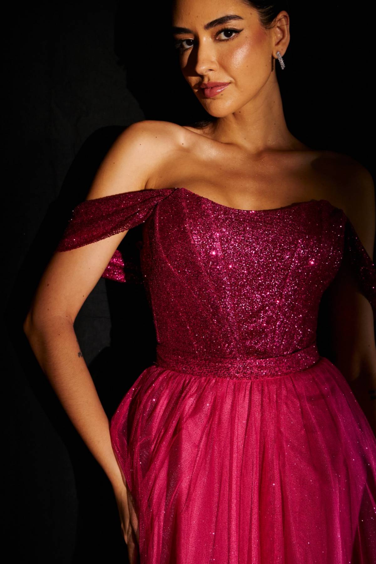 Vestido dois em um na cor Pink, busto de glitter e saia de tule