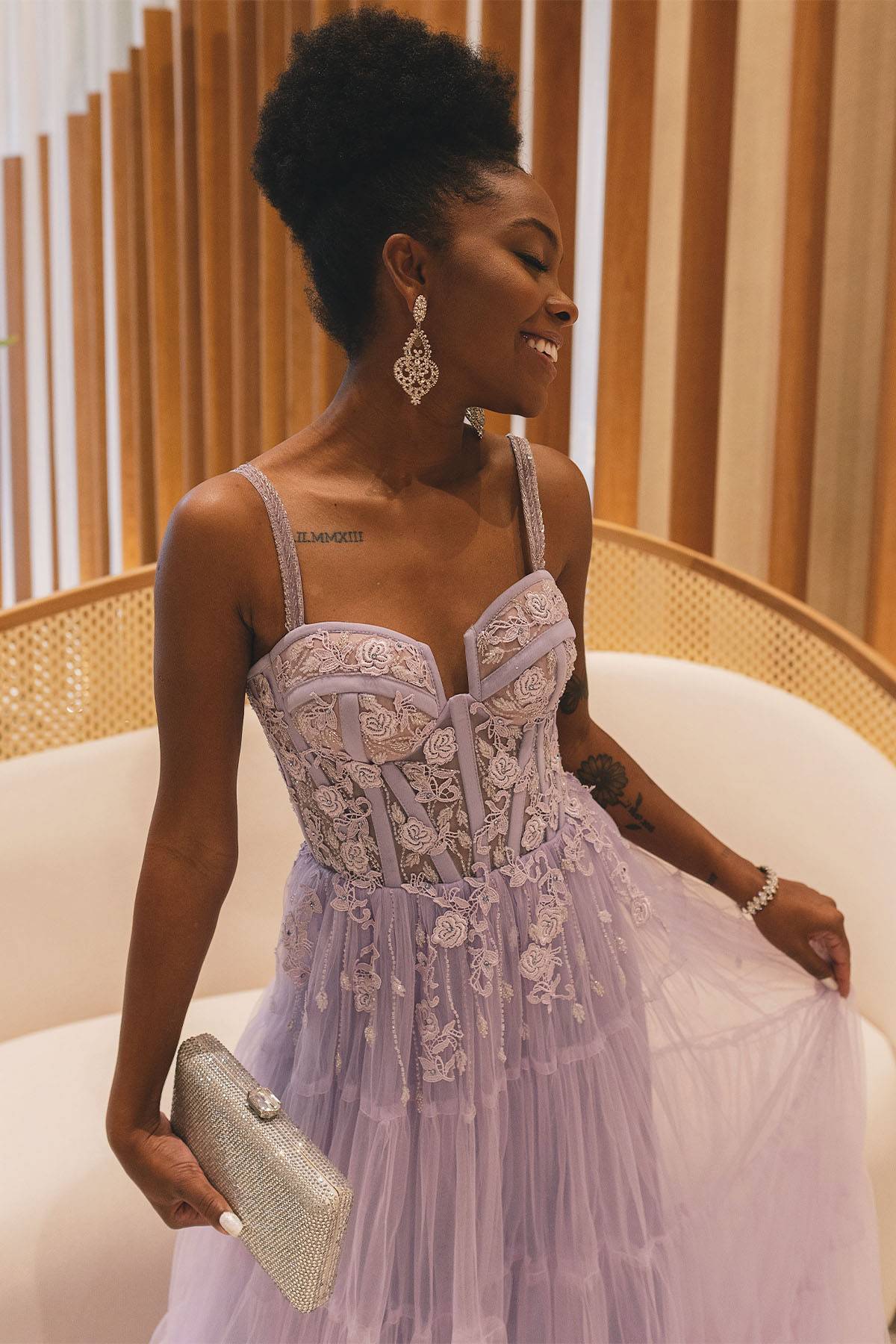 Descrição:Vestido longo em tule lavanda / lilás. Corset bordado a mão com flores 3D.