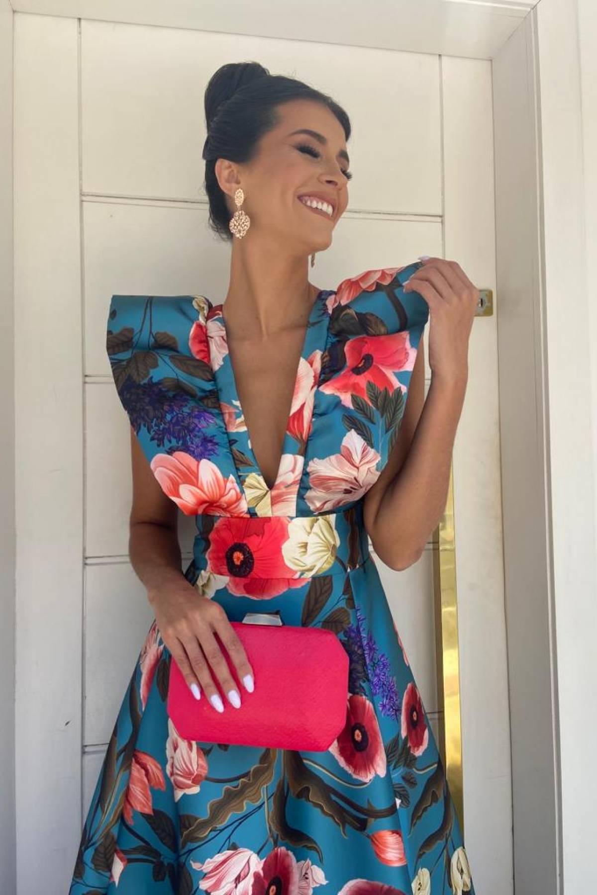 Descrição:Vestido azul / verde alfaiataria estampado com flores, saia ampla