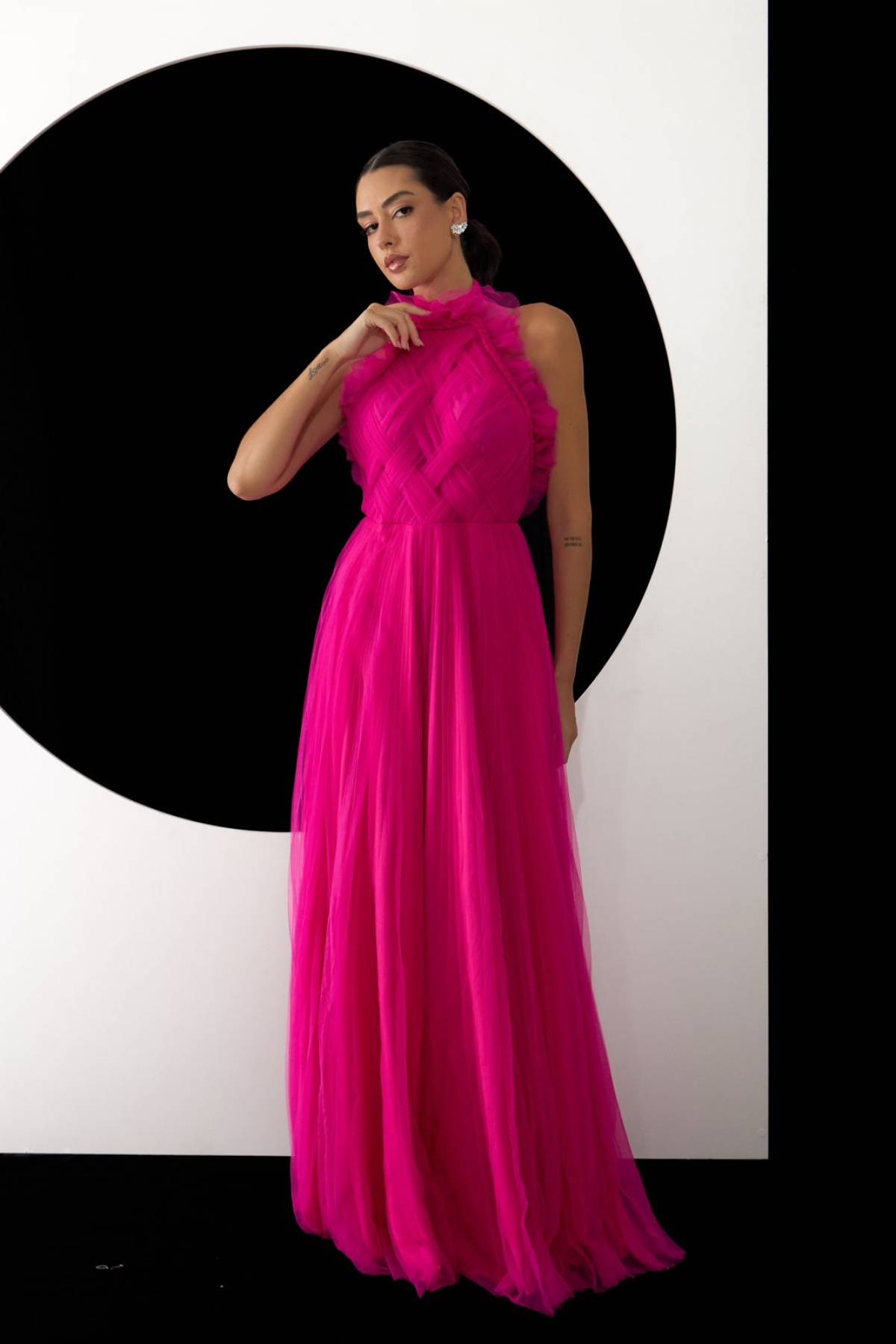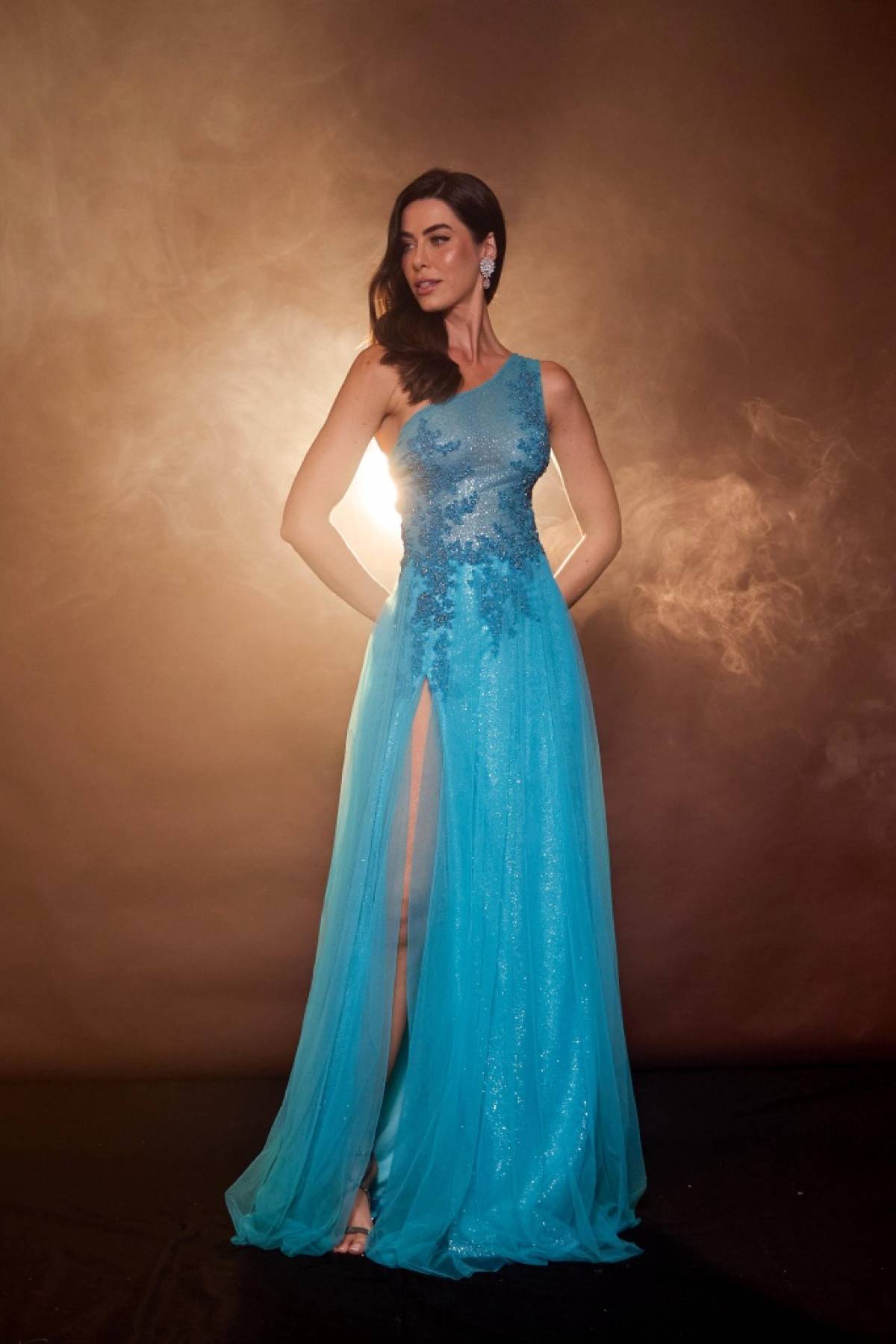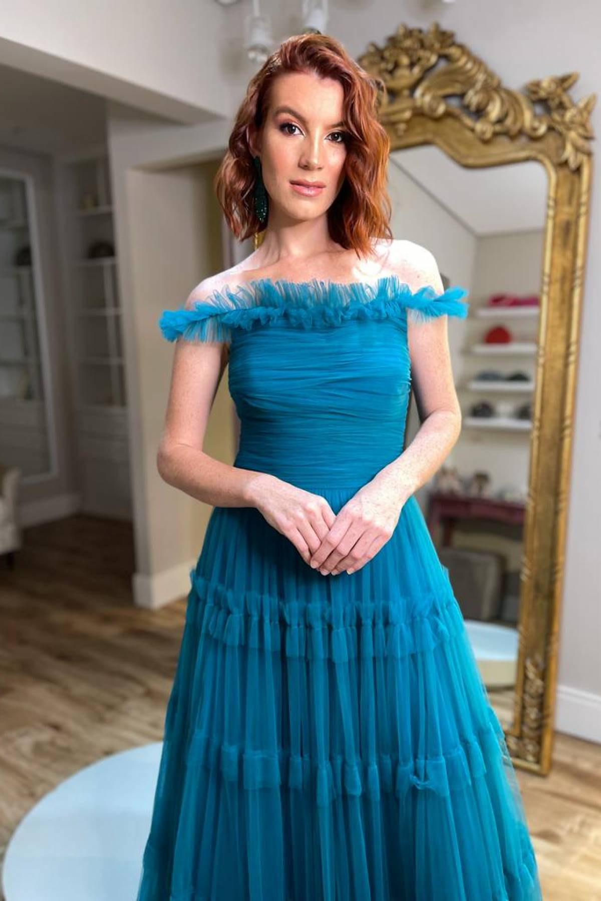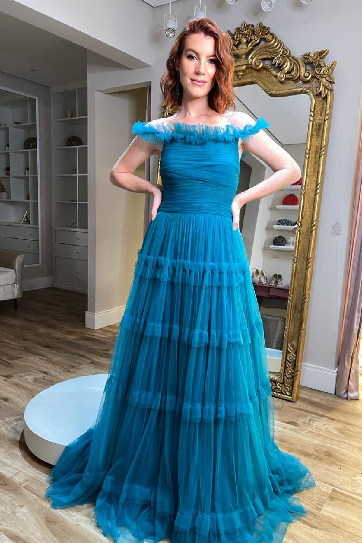Descrição:Vestido verde petróleo de tule ombro a ombro com manga