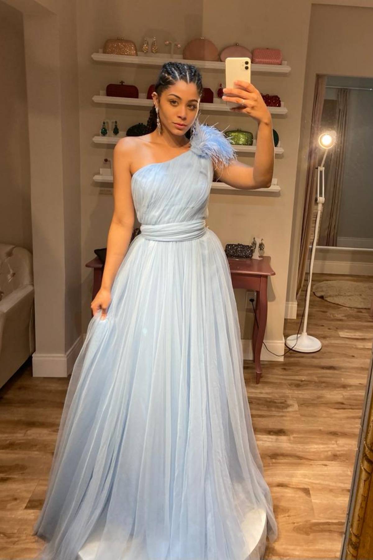 Descrição:Vestido longo, azul serenity, todo de tule com pluma no ombro, saia ampla