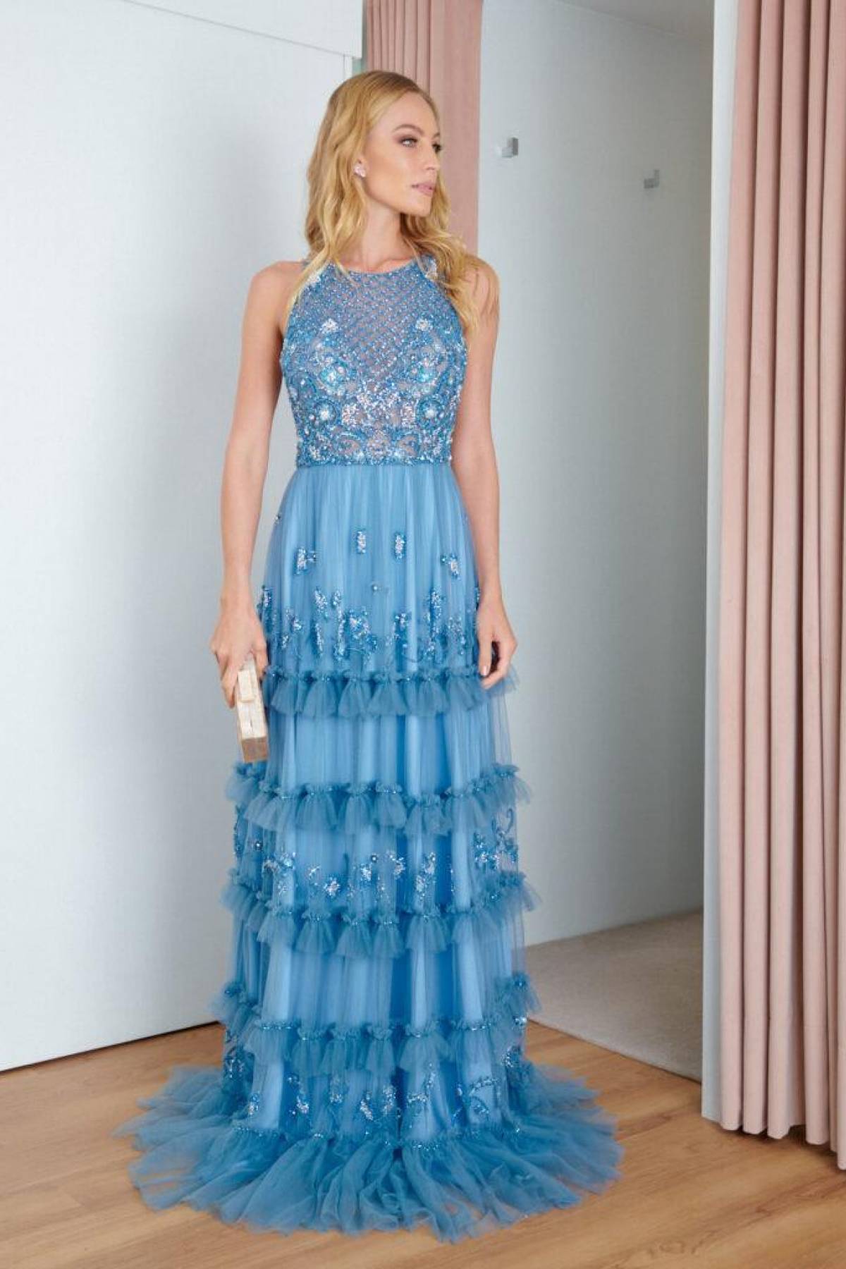Descrição:Vestido azul serenity, semi bordado, saia de tule, com babados, saia ampla