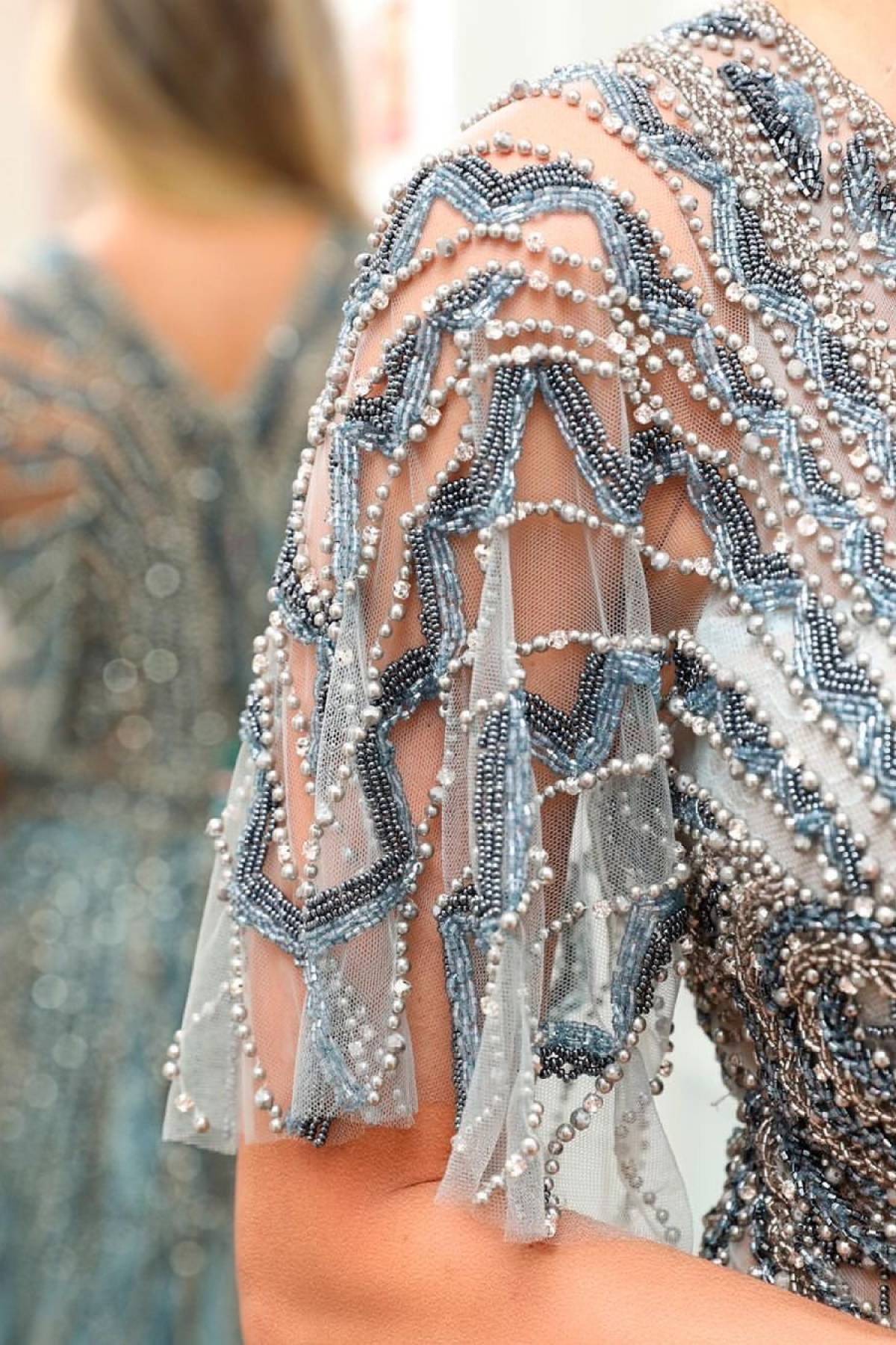 Descrição:Vestido longo, azul serenity todo bordado com mangas 3/4 forro de renda.