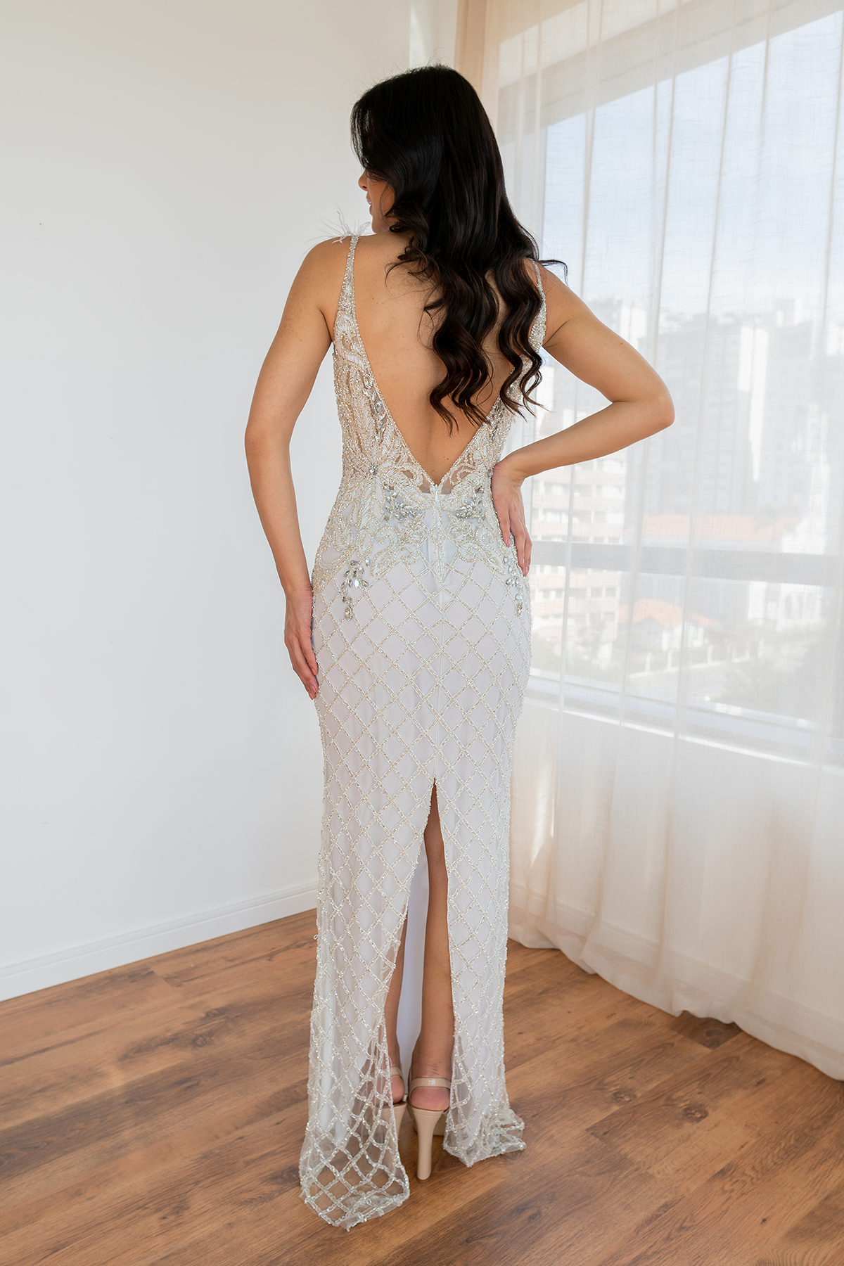 Descrição:Vestido longo branco/off-white com bordado em prata e detalhes em plumas na alça
