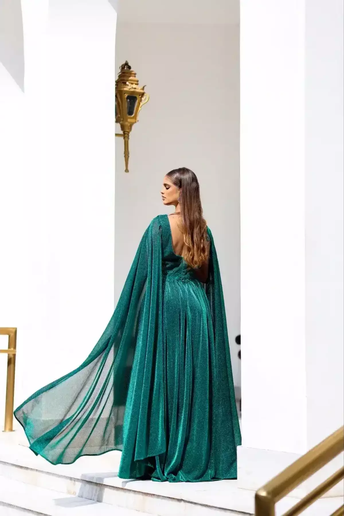 Descrição:Vestido Longo em Lurex. Possui fenda, bordado na cintura e manga capa.