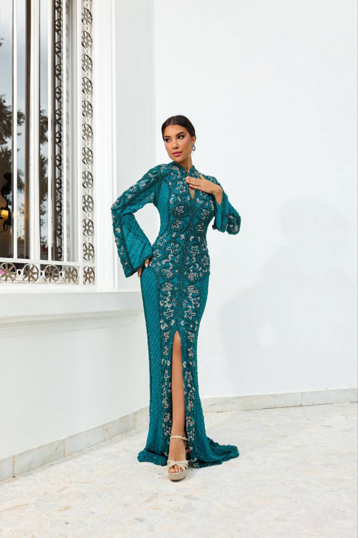 Descrição:Vestido longo colorido, com alças finas e decote profundo no busto.