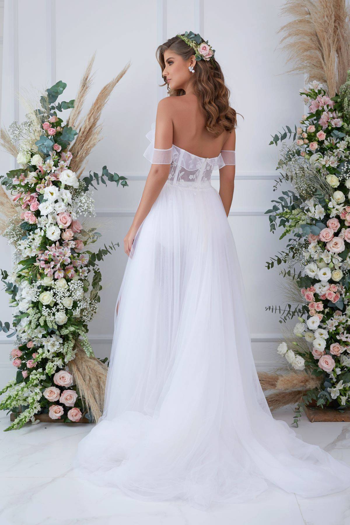 Descrição:Vestido tule, corpete bordado, ombro a ombro, com fenda.