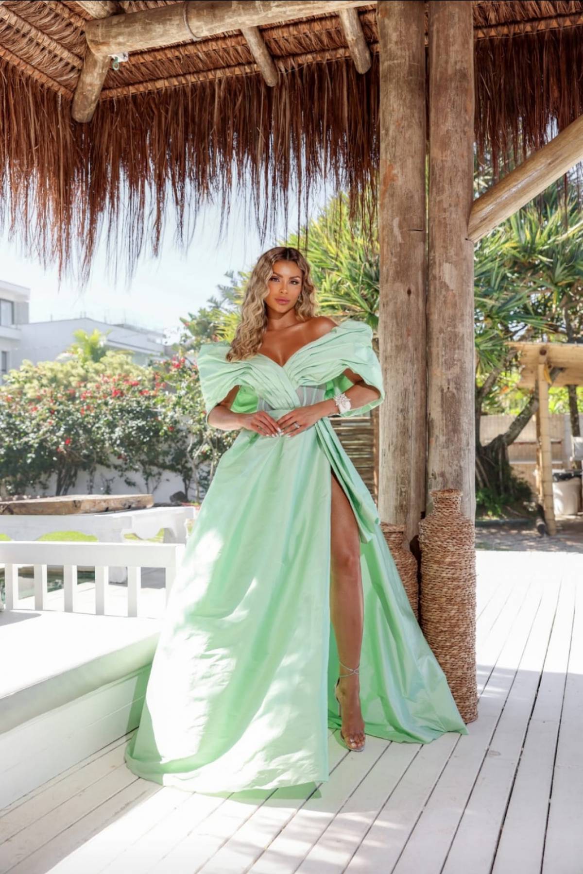 Descrição:Vestido longo, bordado, recortes nas costas, fenda.