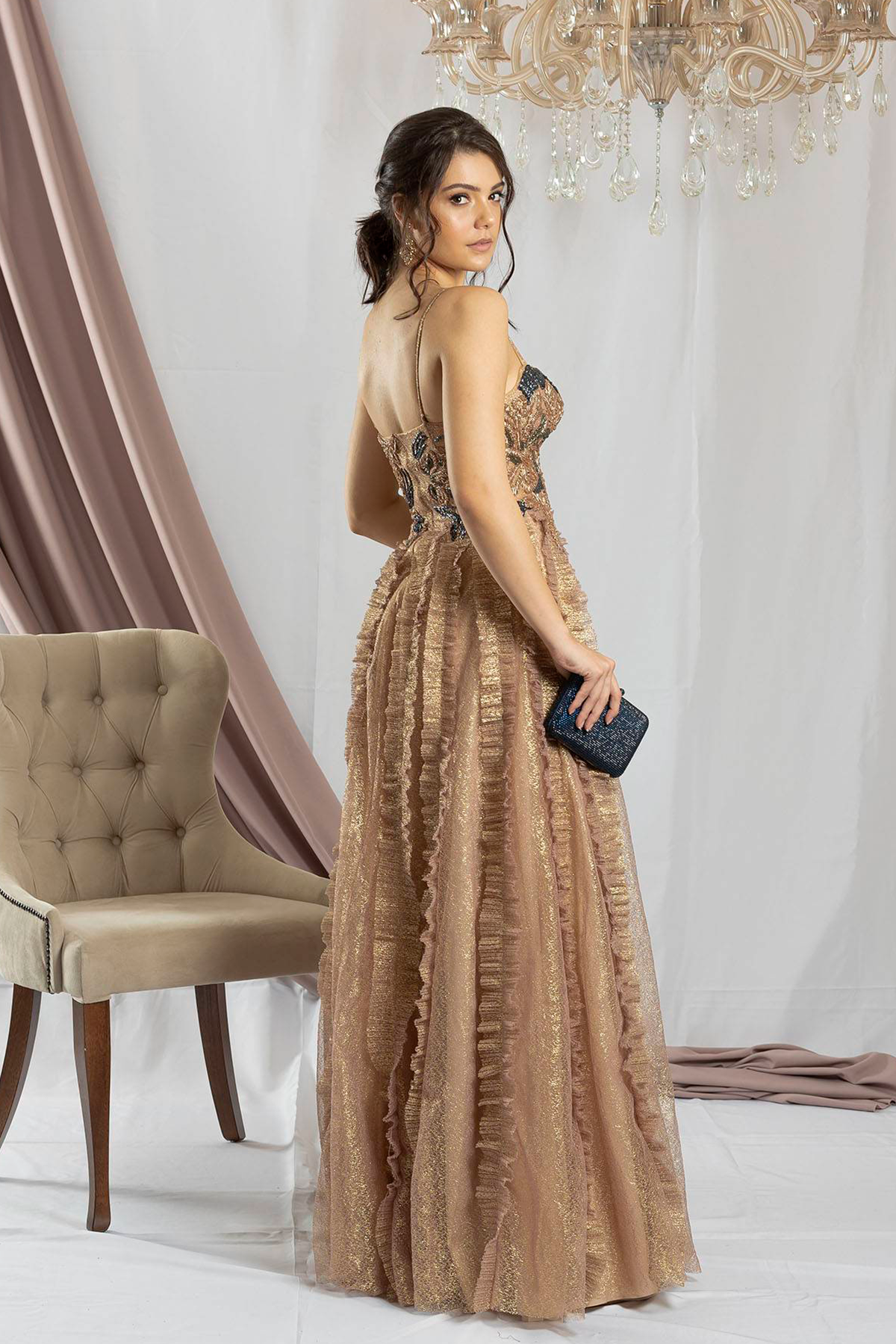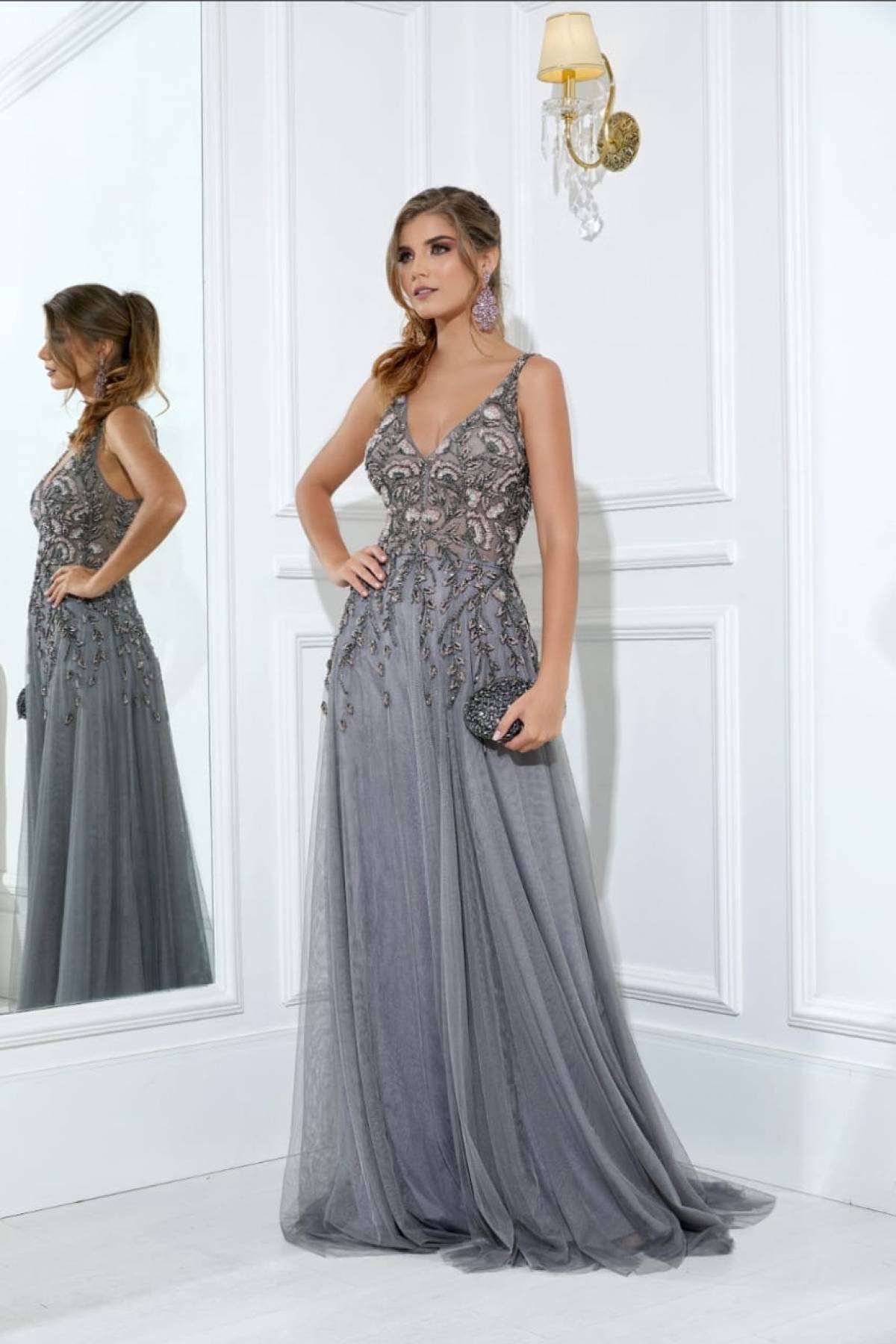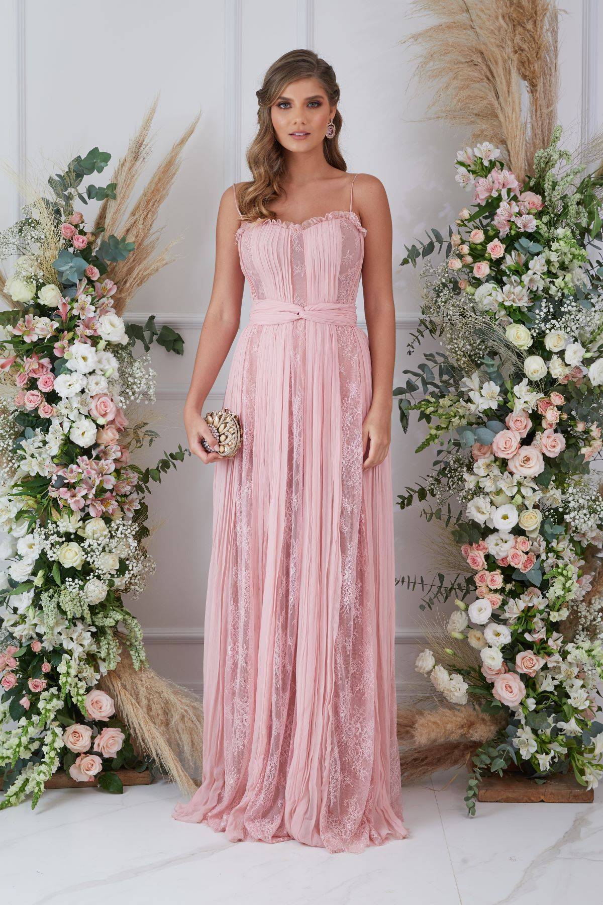 Descrição:Vestido longo, tule, busto bordado, alça fina.