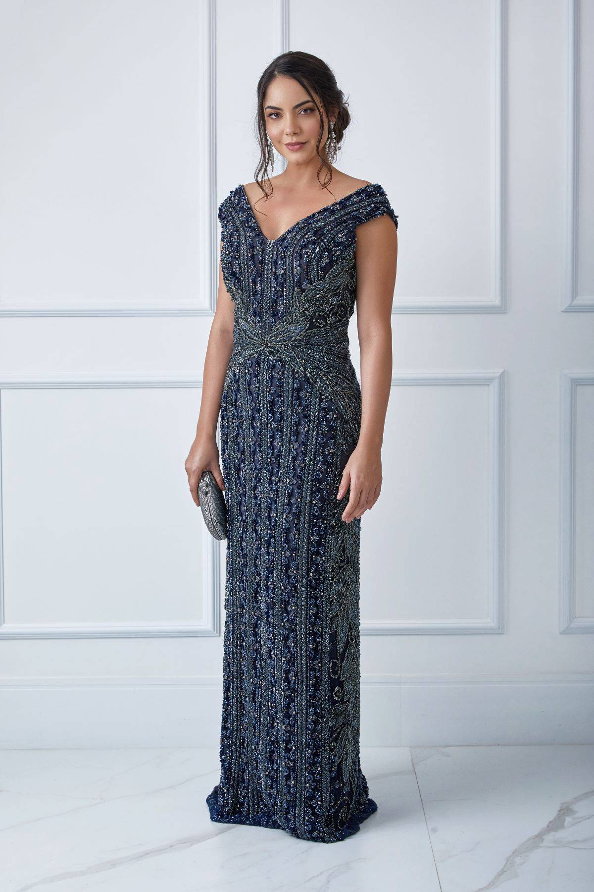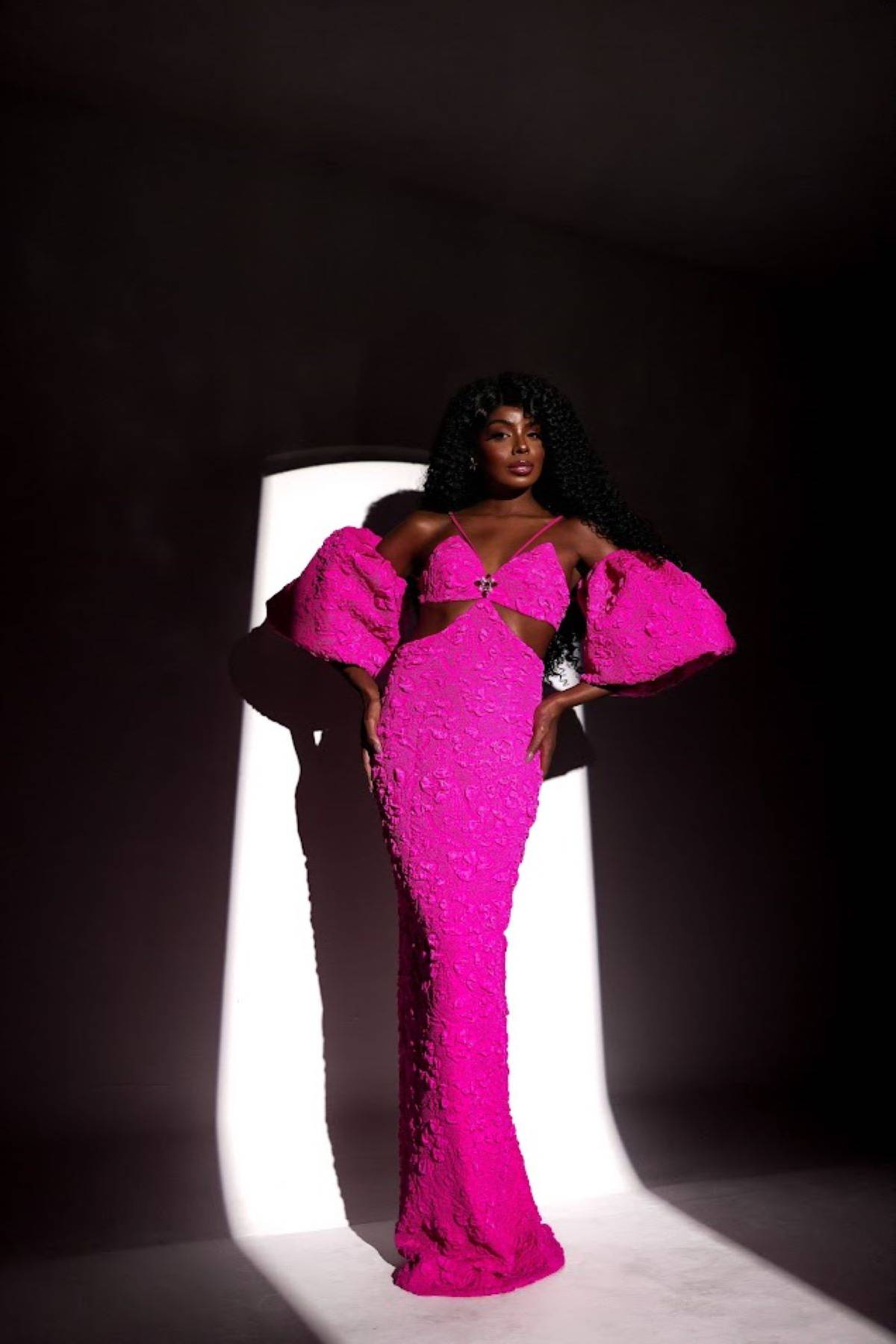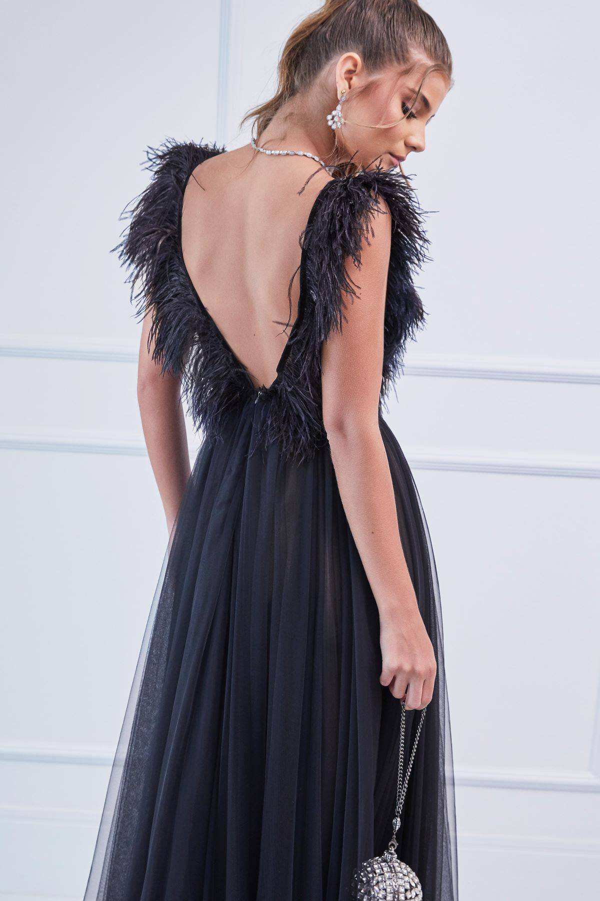 Descrição:Vestido longo, tule, volumoso, plumas.