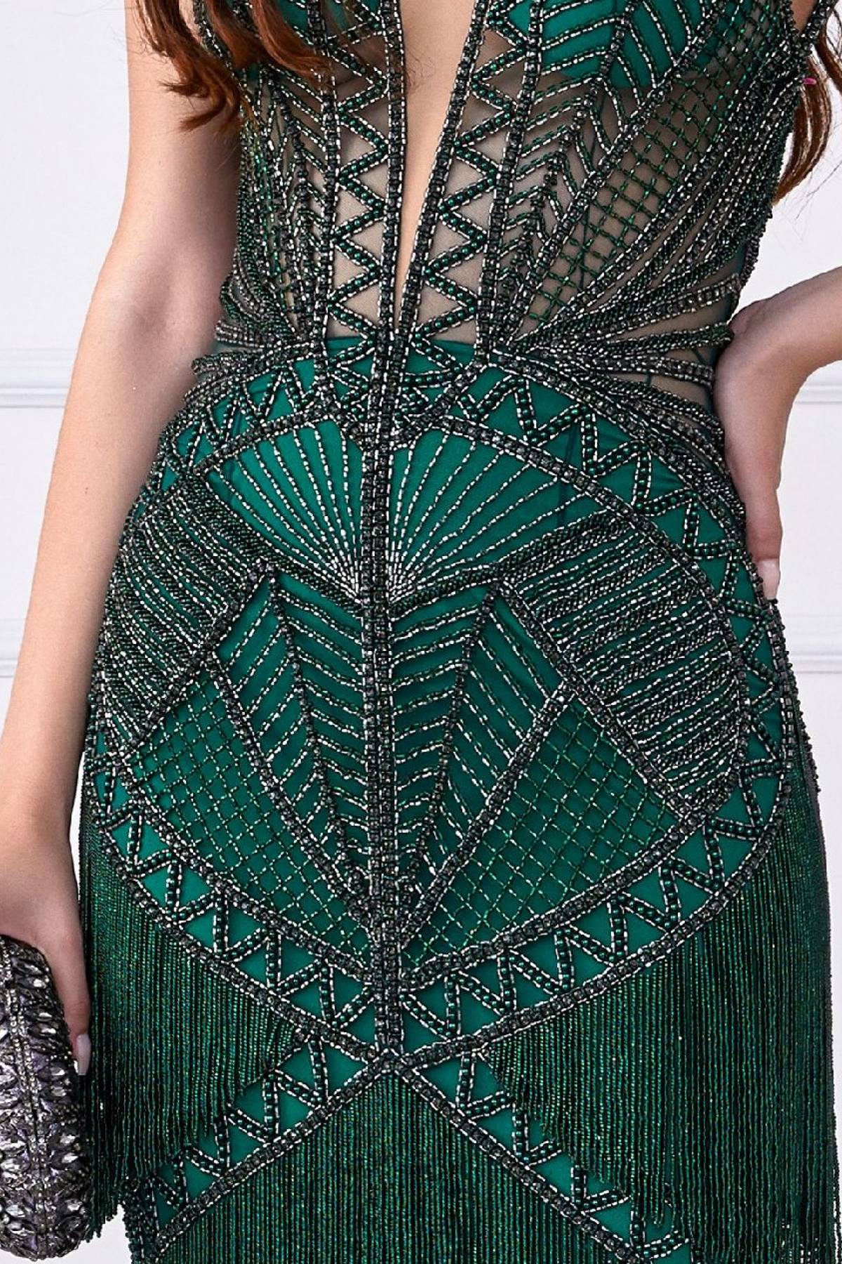 Descrição:Vestido longo, bordado, franjas.