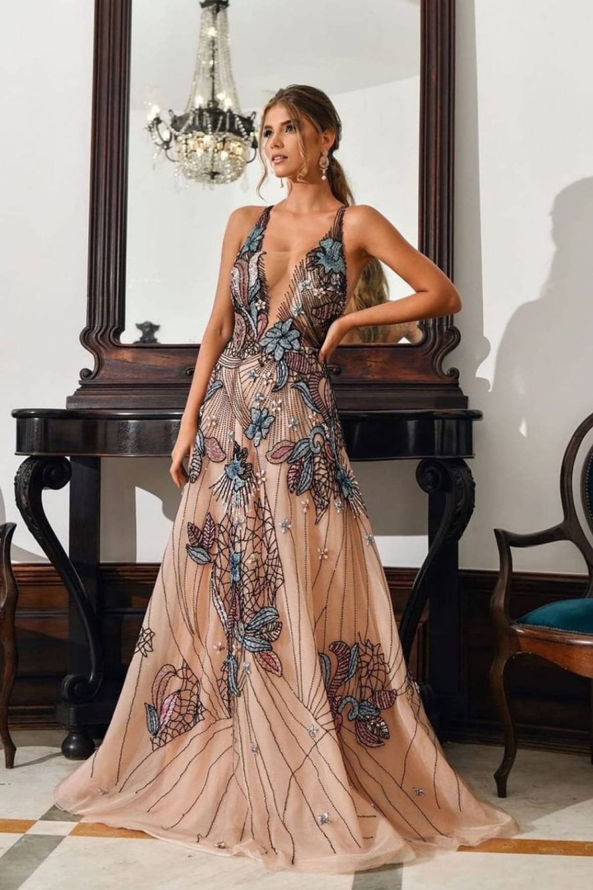 Descrição:Vestido longo, tule, bordado na parte superior.