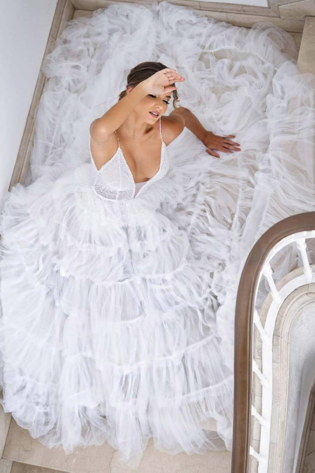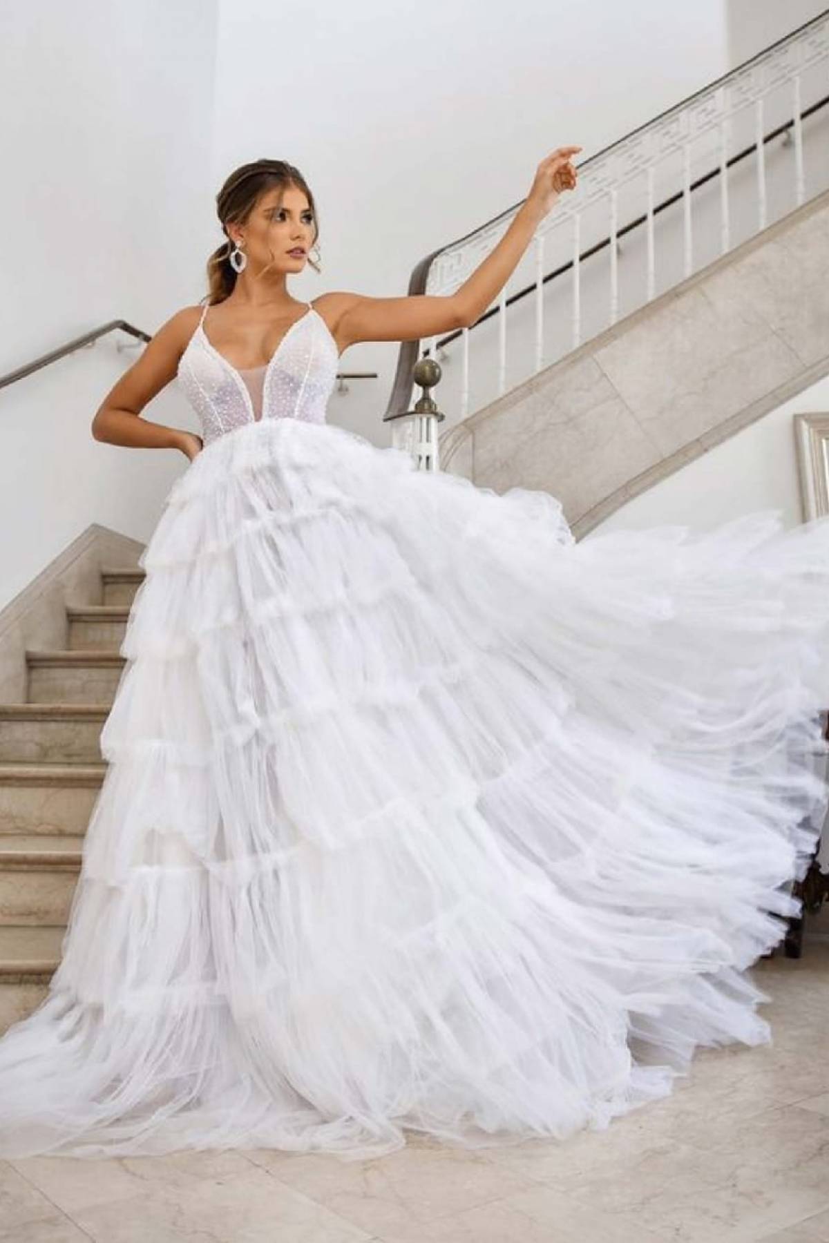 Descrição:Vestido longo, tule, alça fina, busto bordado em pérolas, saia em camadas.