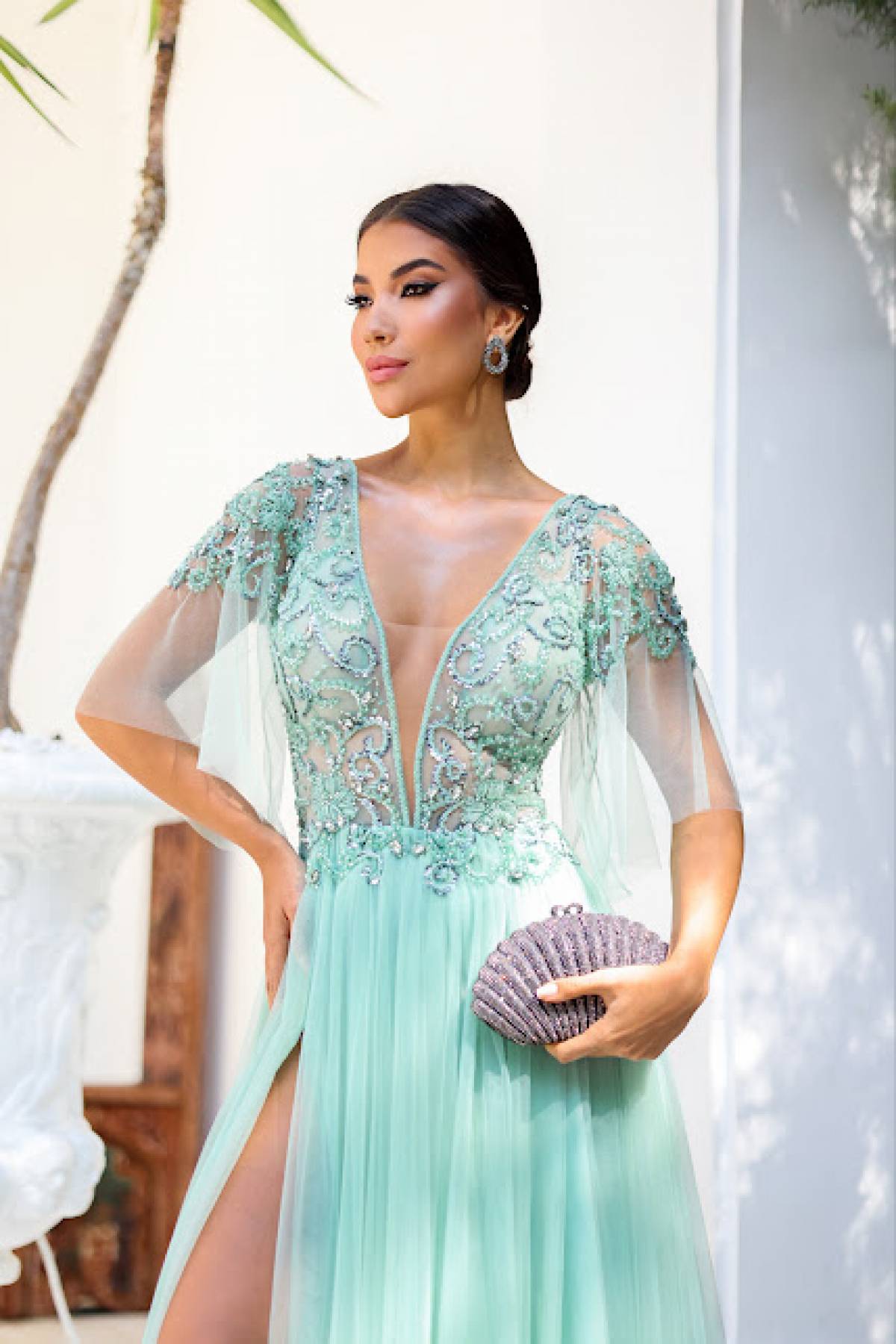 Descrição:Vestido longo, tule, bordado na parte superior, manga, fenda.