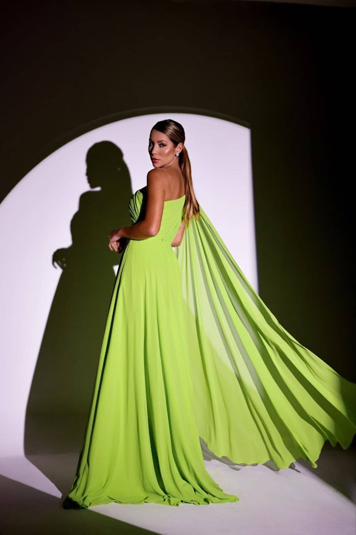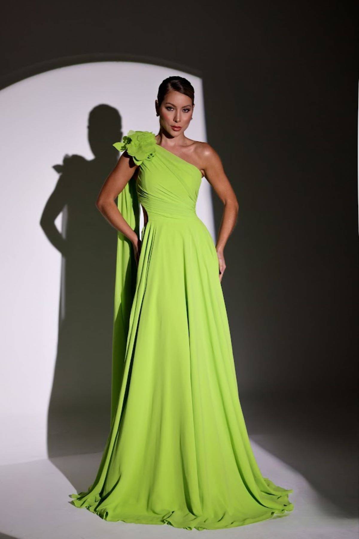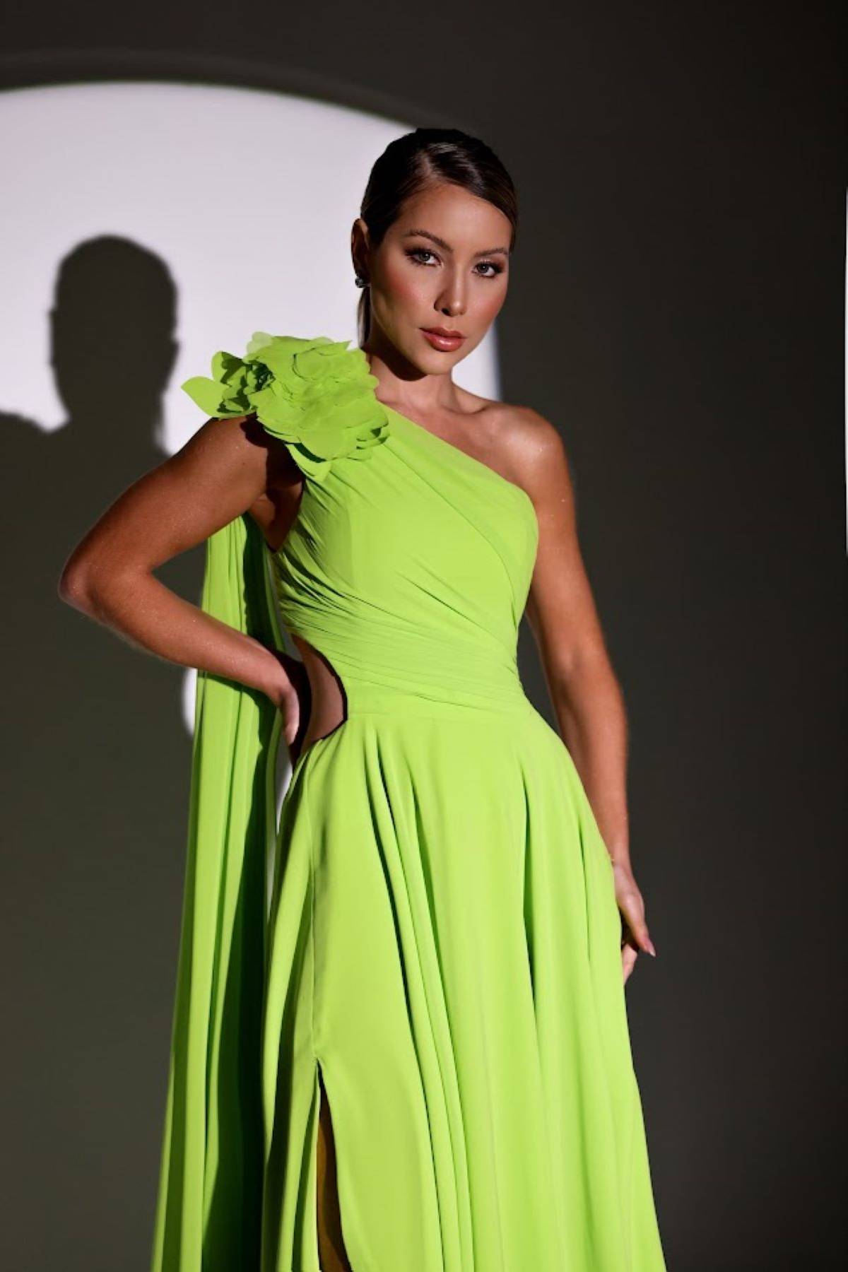 Descrição:Vestido longo, fluido,  liso, de um ombro só,  capa, fenda, recorte na cintura, aplicação de flor opcional.