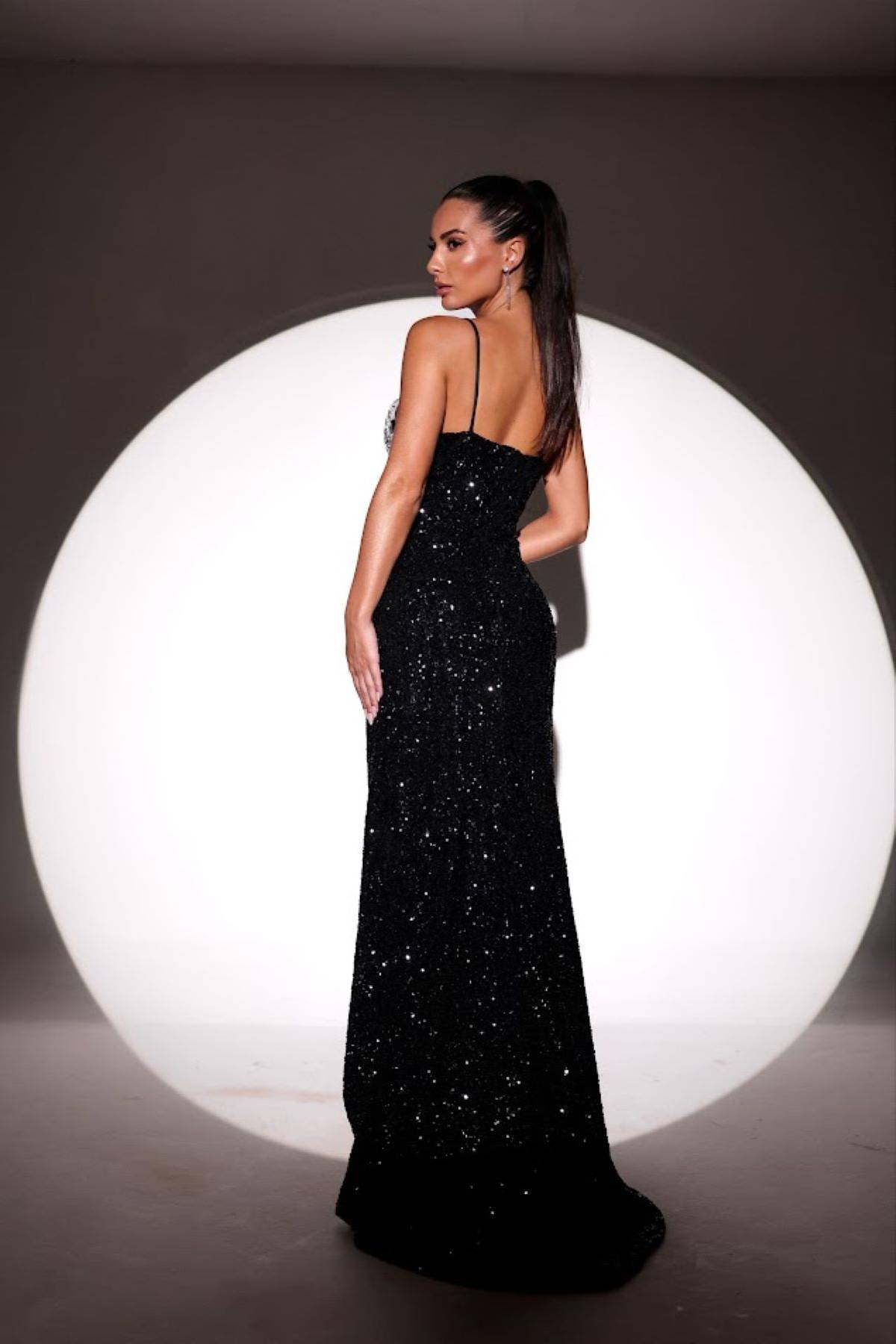 Descrição:Vestido longo, paetê, busto em pedraria