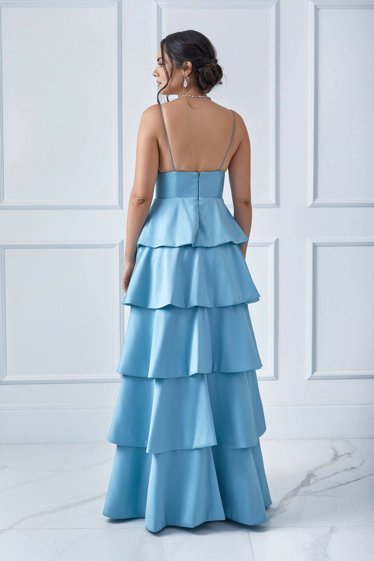 Descrição:Vestido longo, alfaiataria, alça fina, saia em camadas