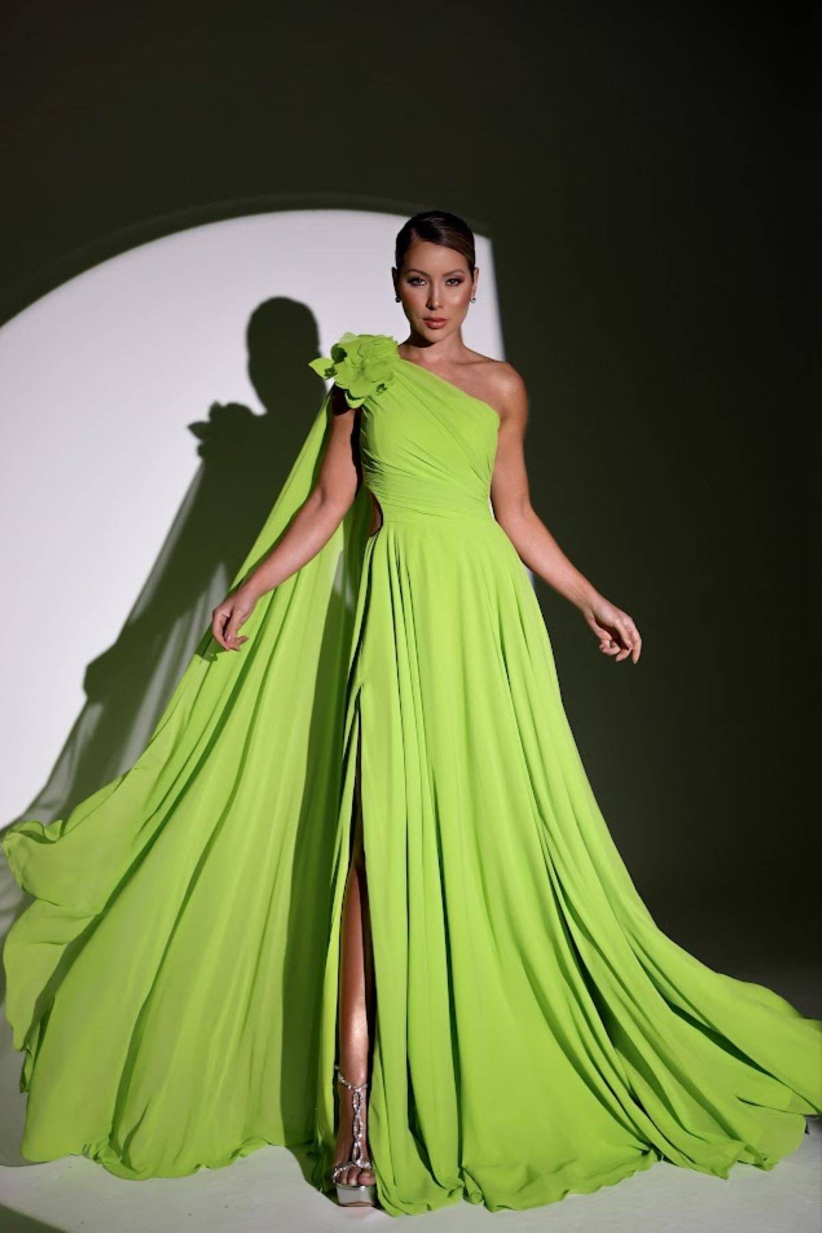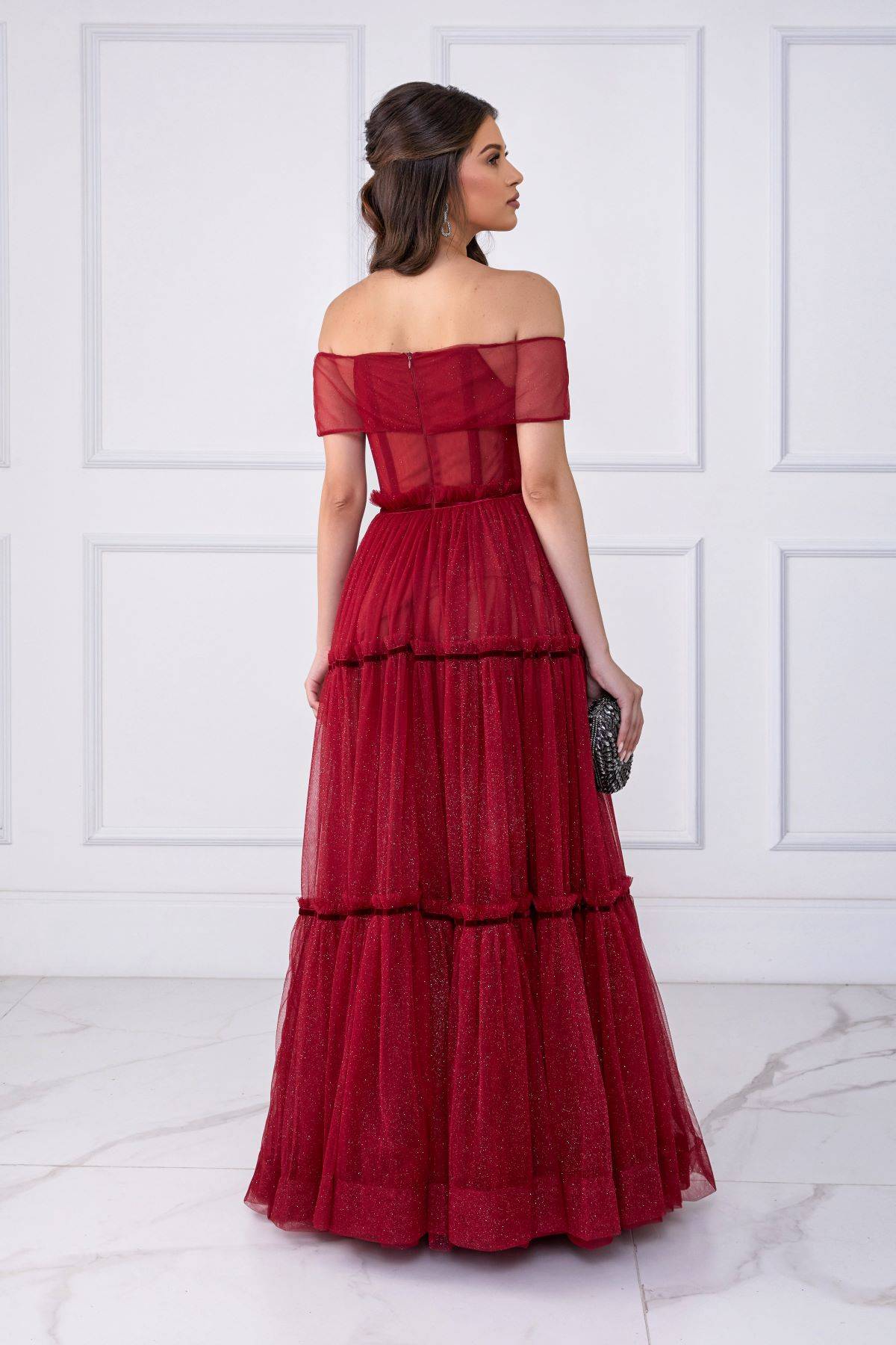 Descrição:Vestido longo, tule, glitterizado, ombro a ombro.