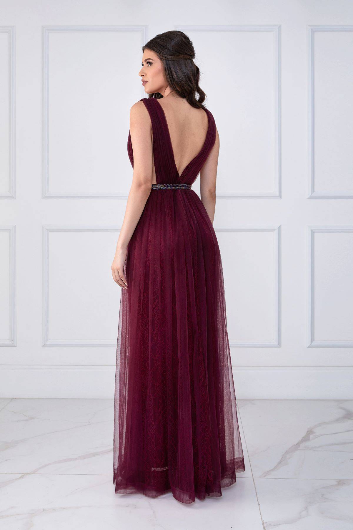 Descrição:Vestido longo, tule, forro com renda, fenda.