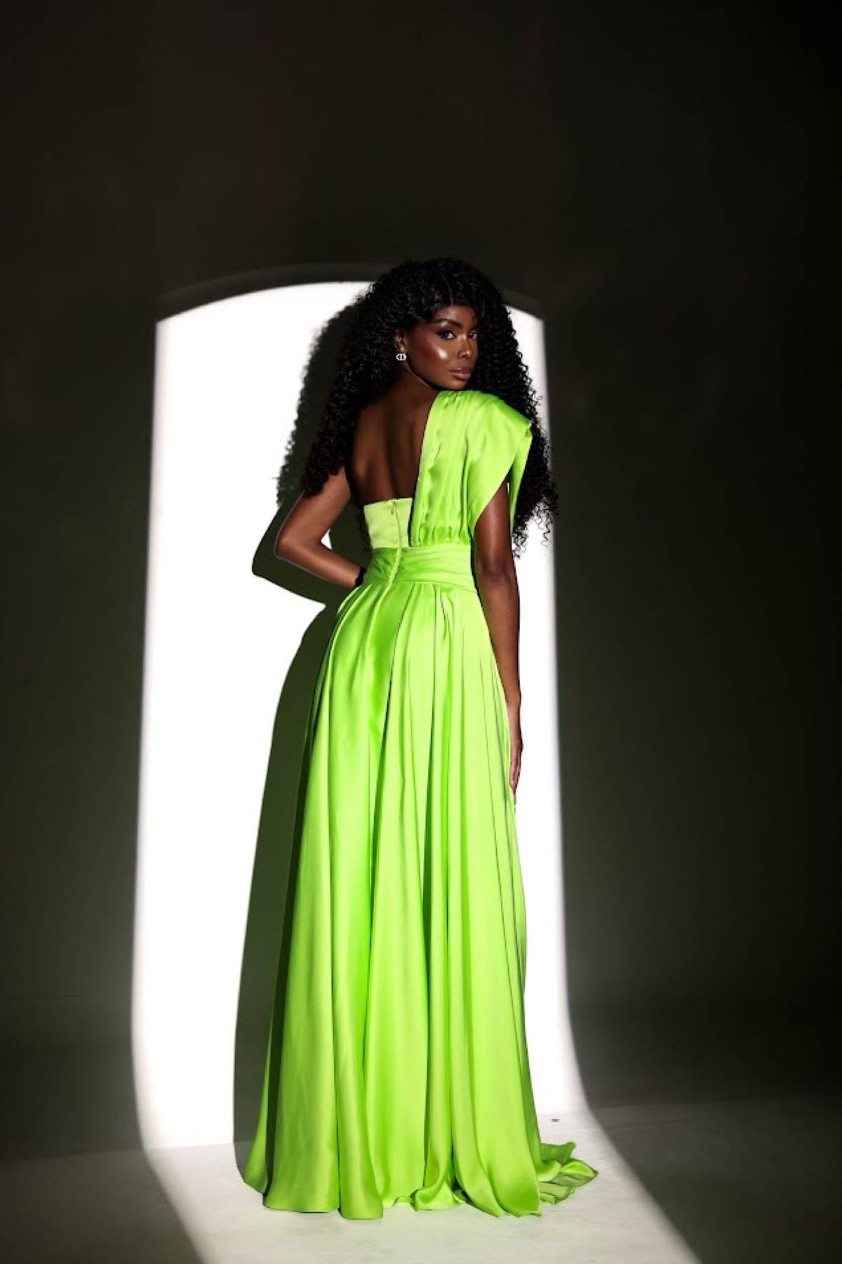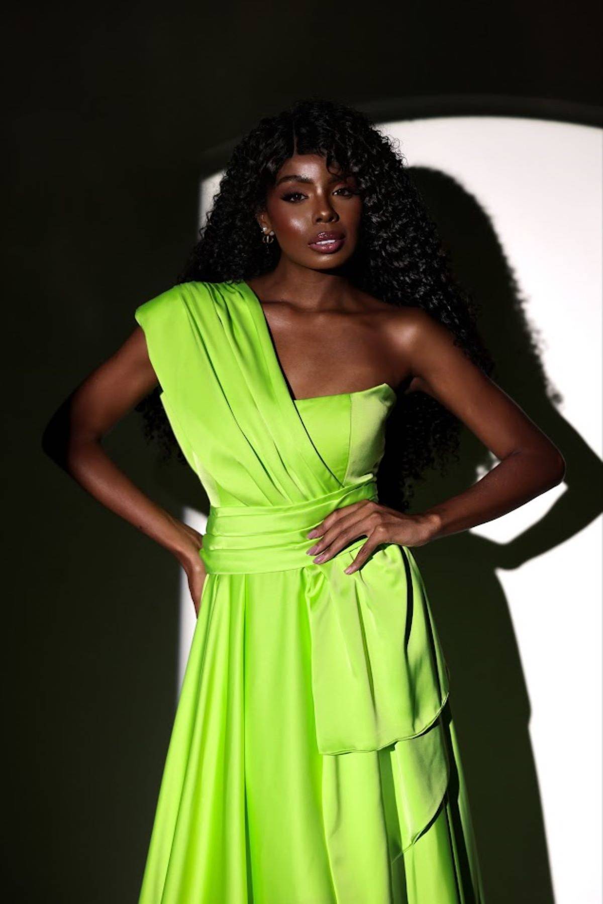 Descrição:Vestido longo, liso, ombro só, recorte na cintura, flor removível.