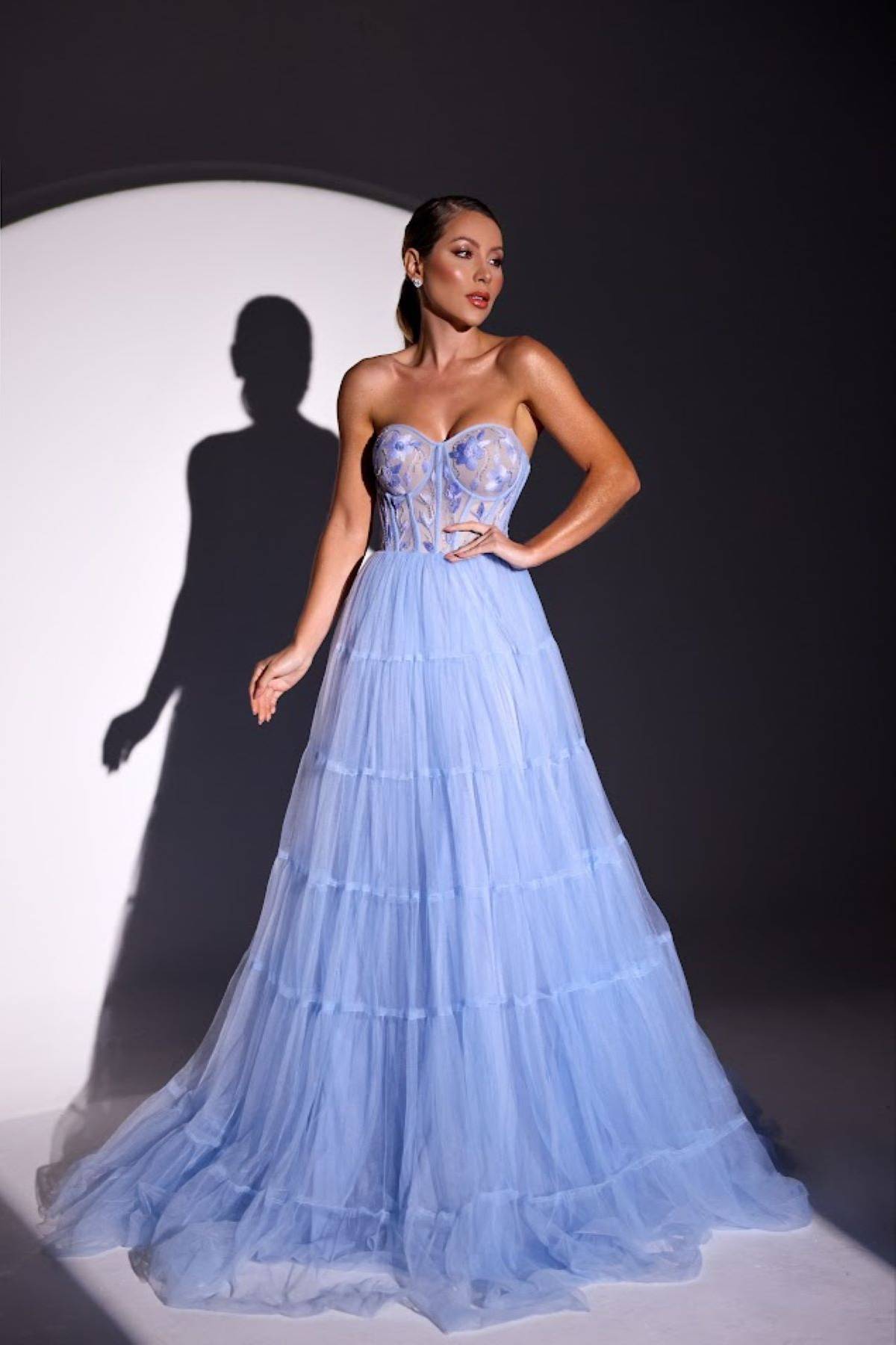 Descrição:Vestido longo, tule, bordado, manga flare.