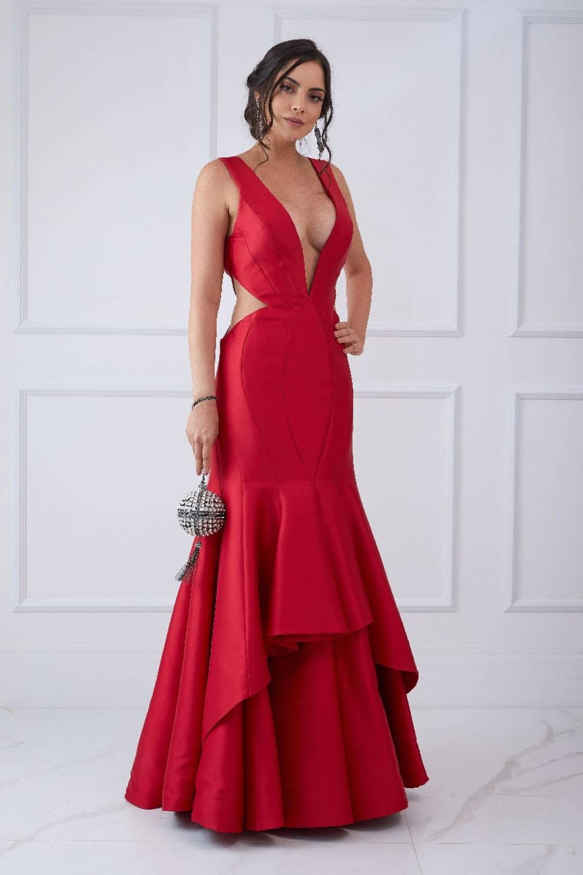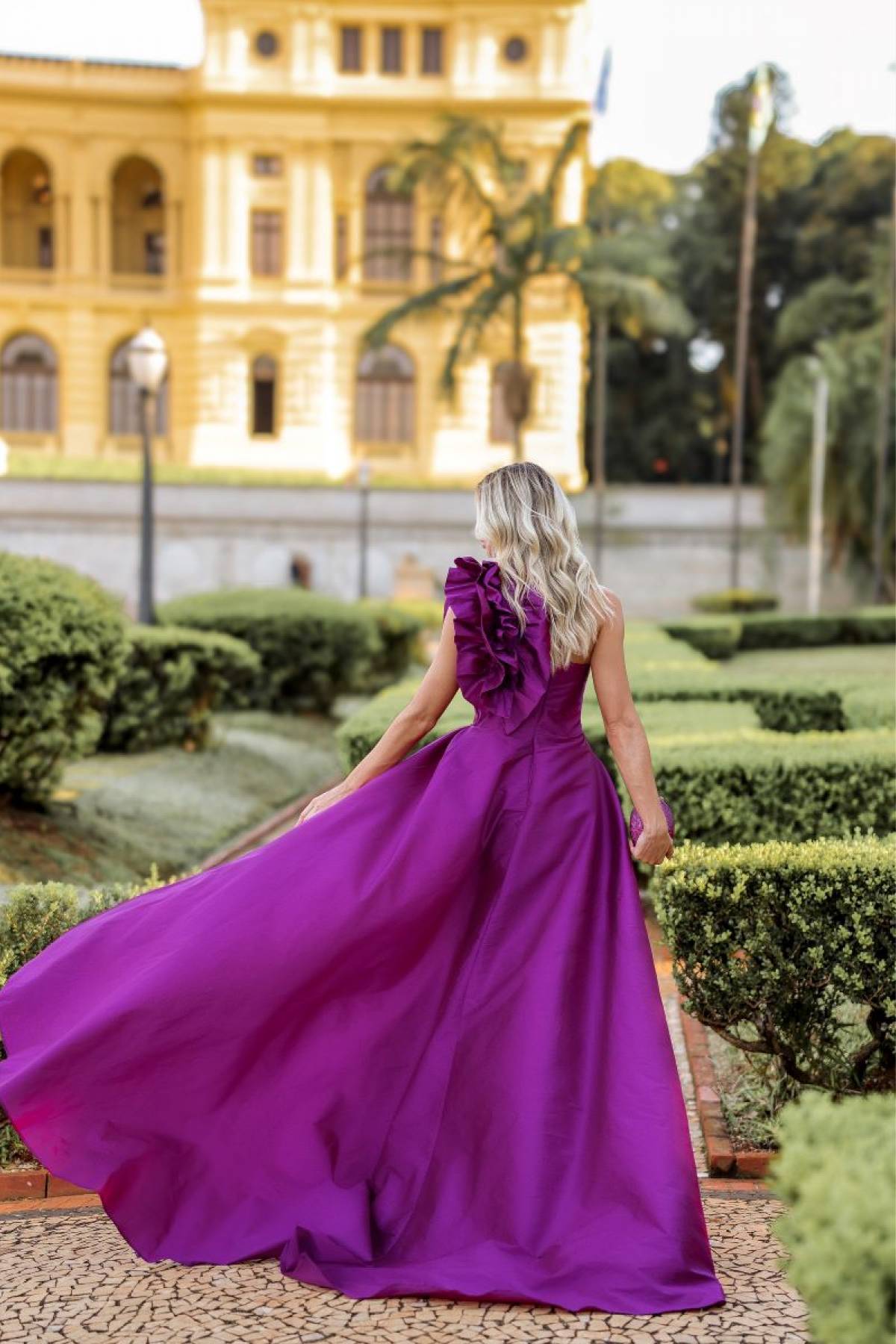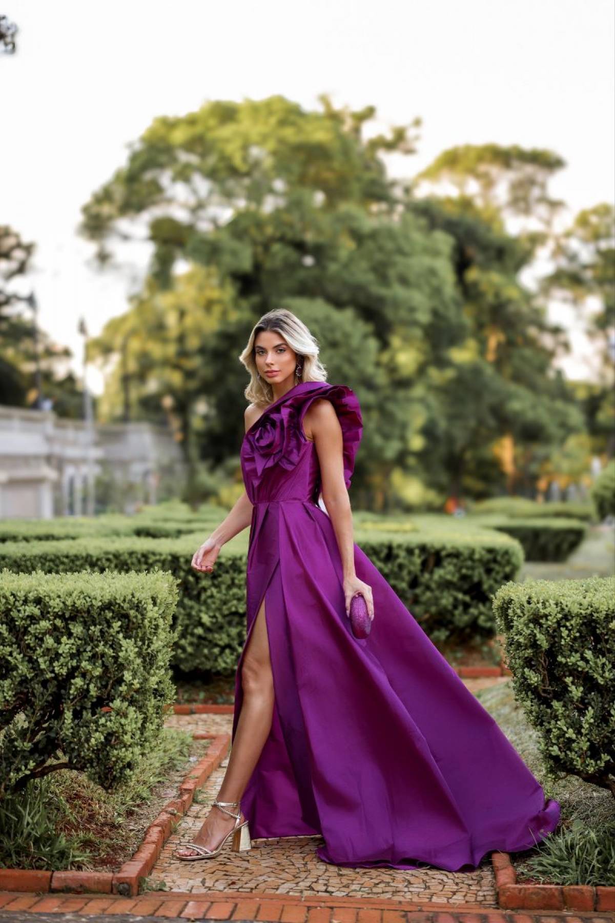 Vestido longo, estruturado, fenda, um ombro só, detalhe em flor.