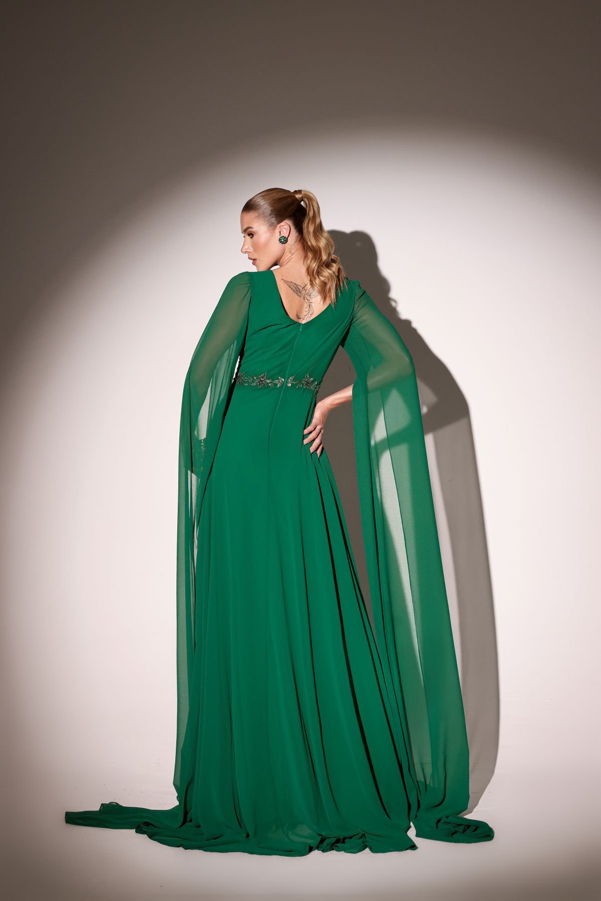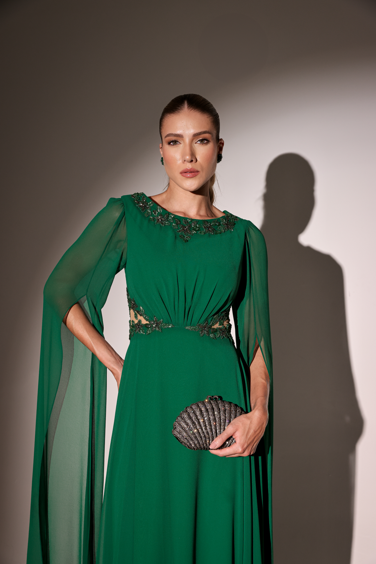 Descrição:Vestido longo verde, com detalhes na cintura decote canoa, mangas capa.