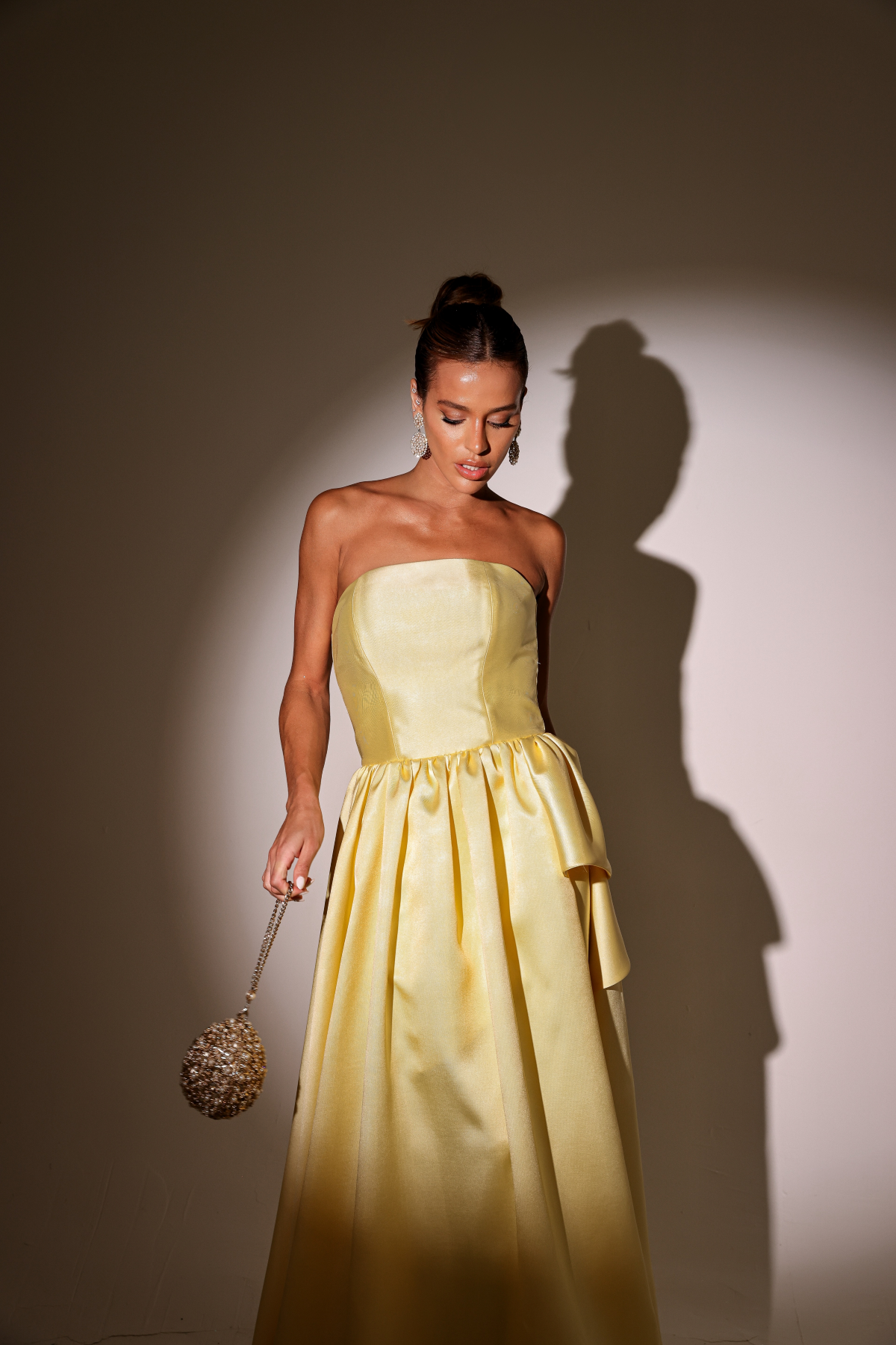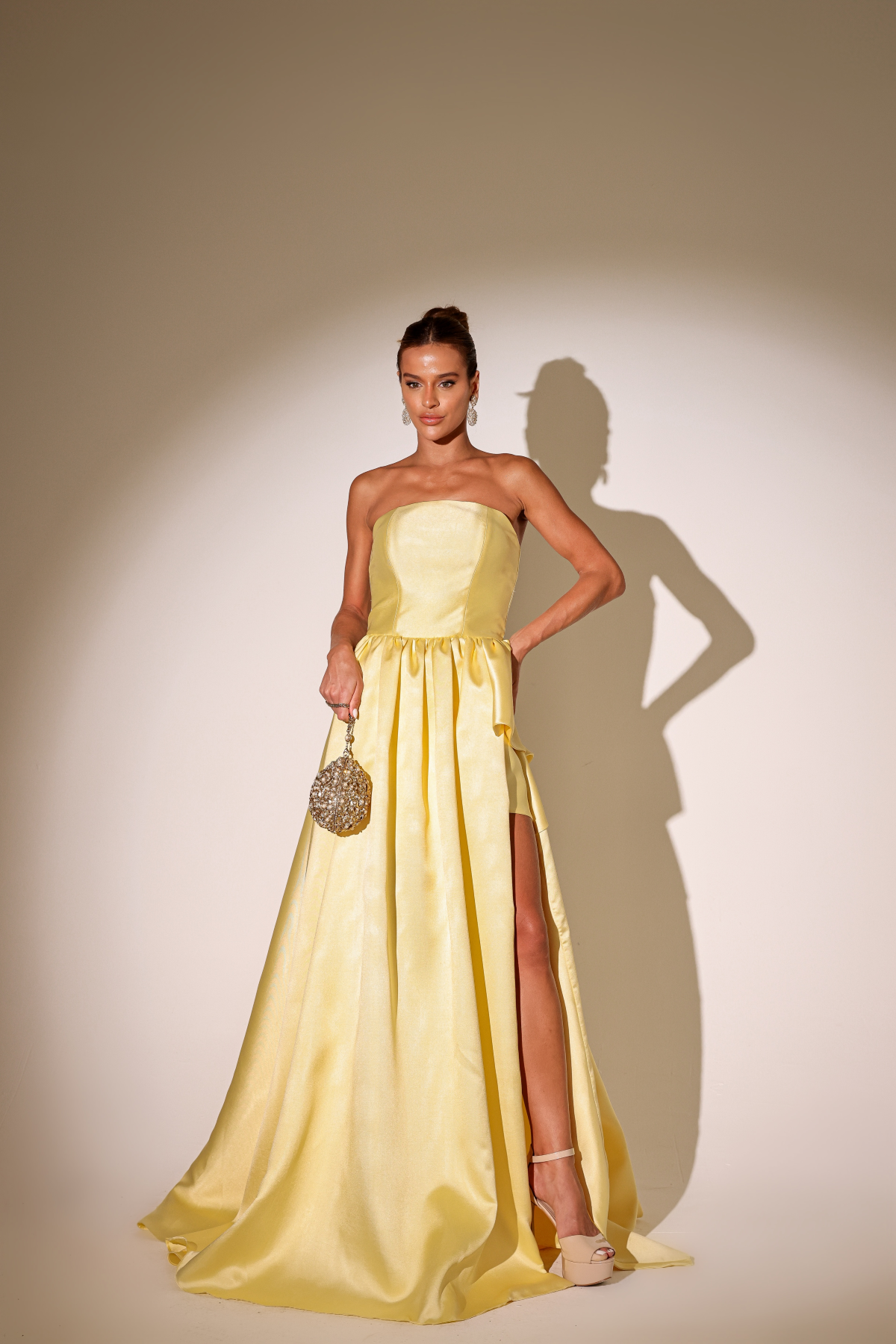 Descrição:Vestido amarelo manteiga em zibeline, tomara que caia, com fenda.