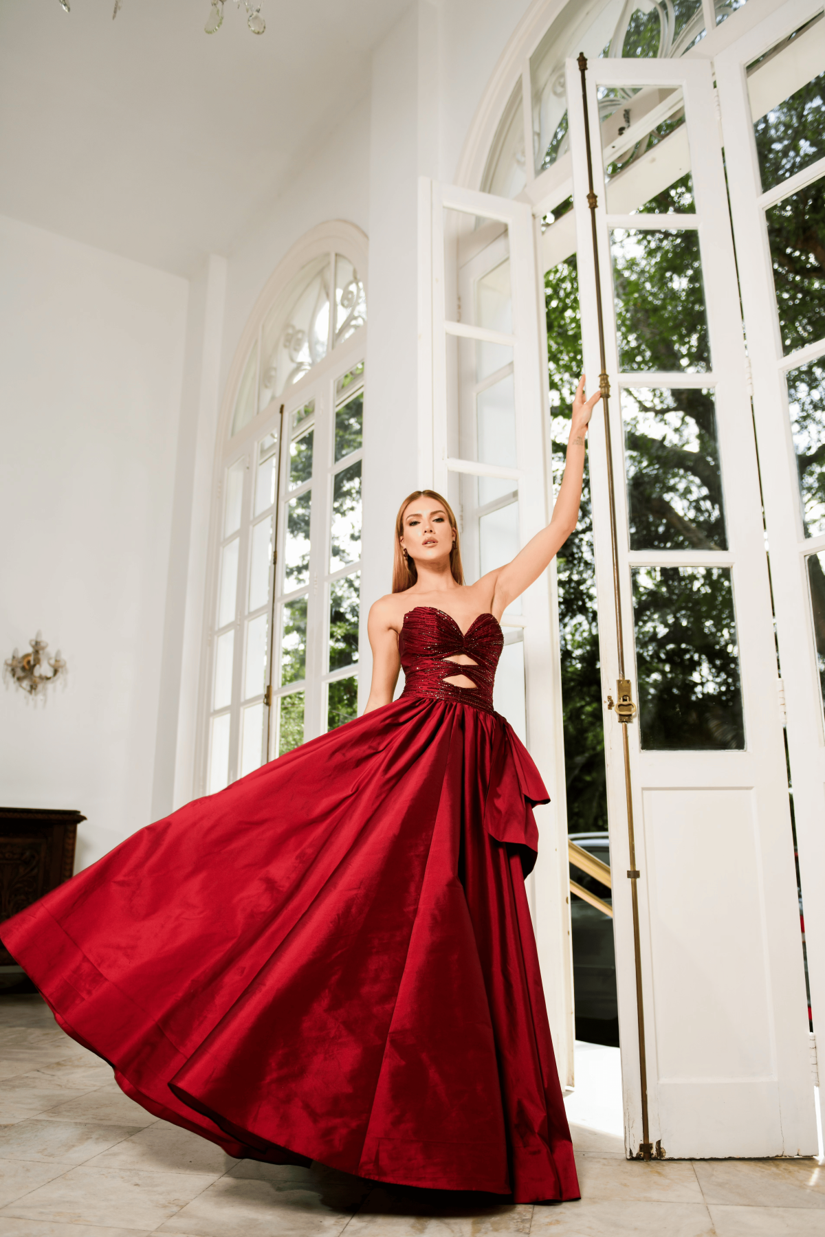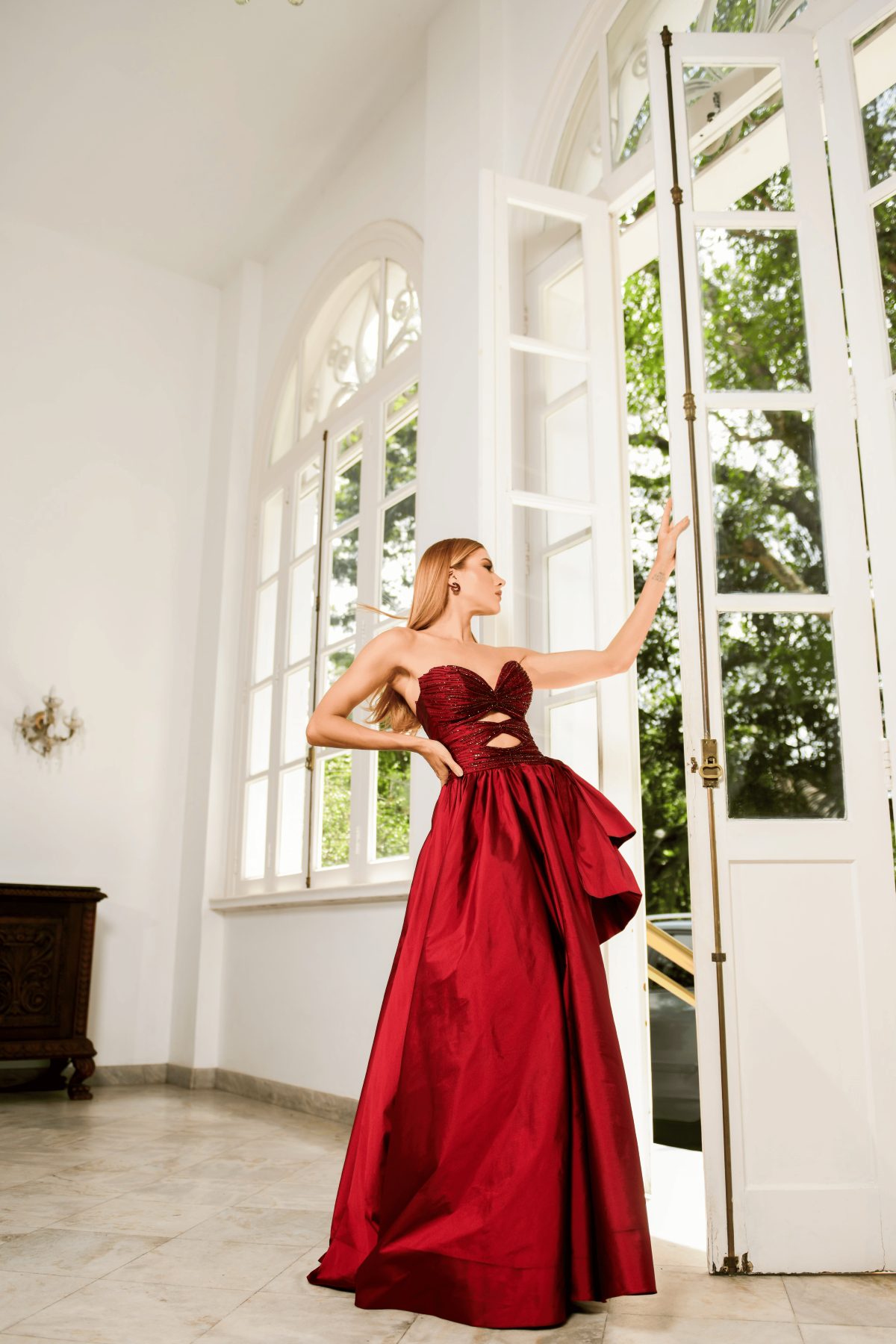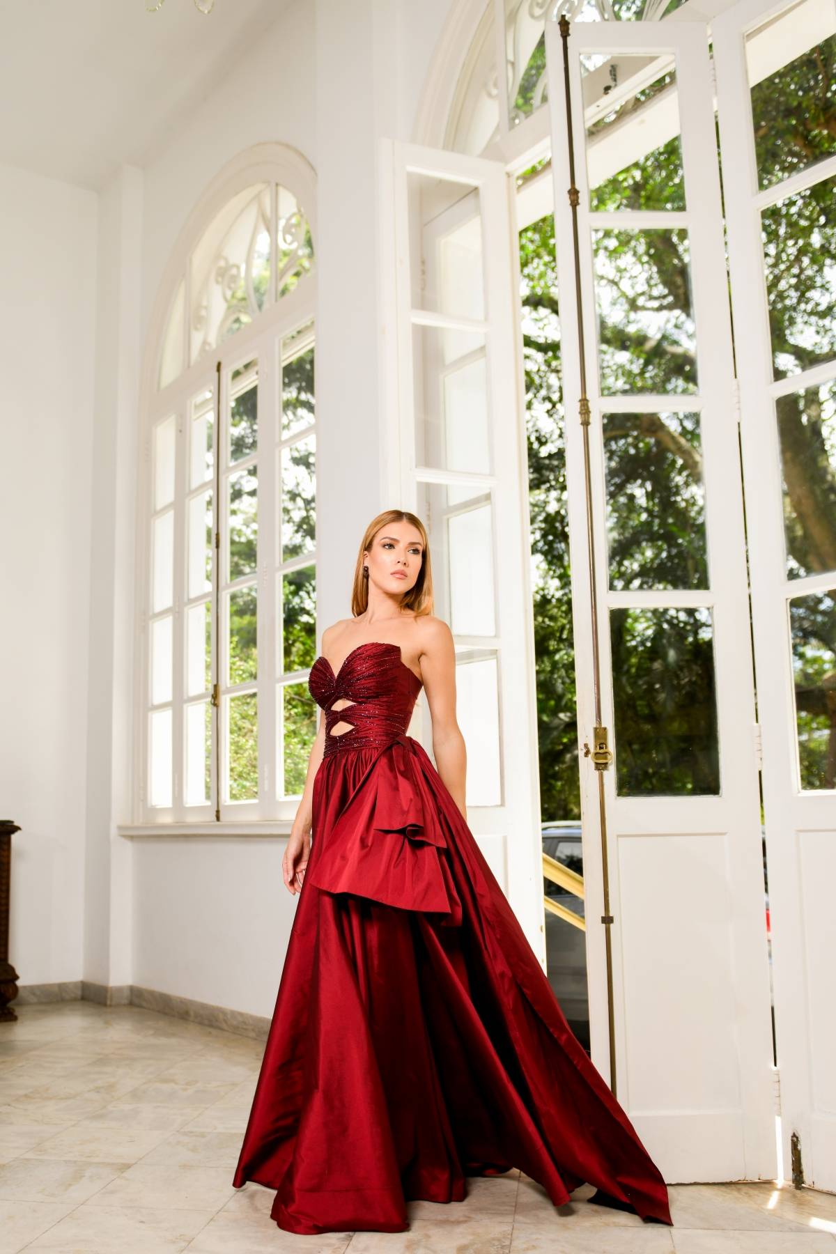 Descrição:Vestido em Tafetá Marsala, tomara que caia com bordados no busto