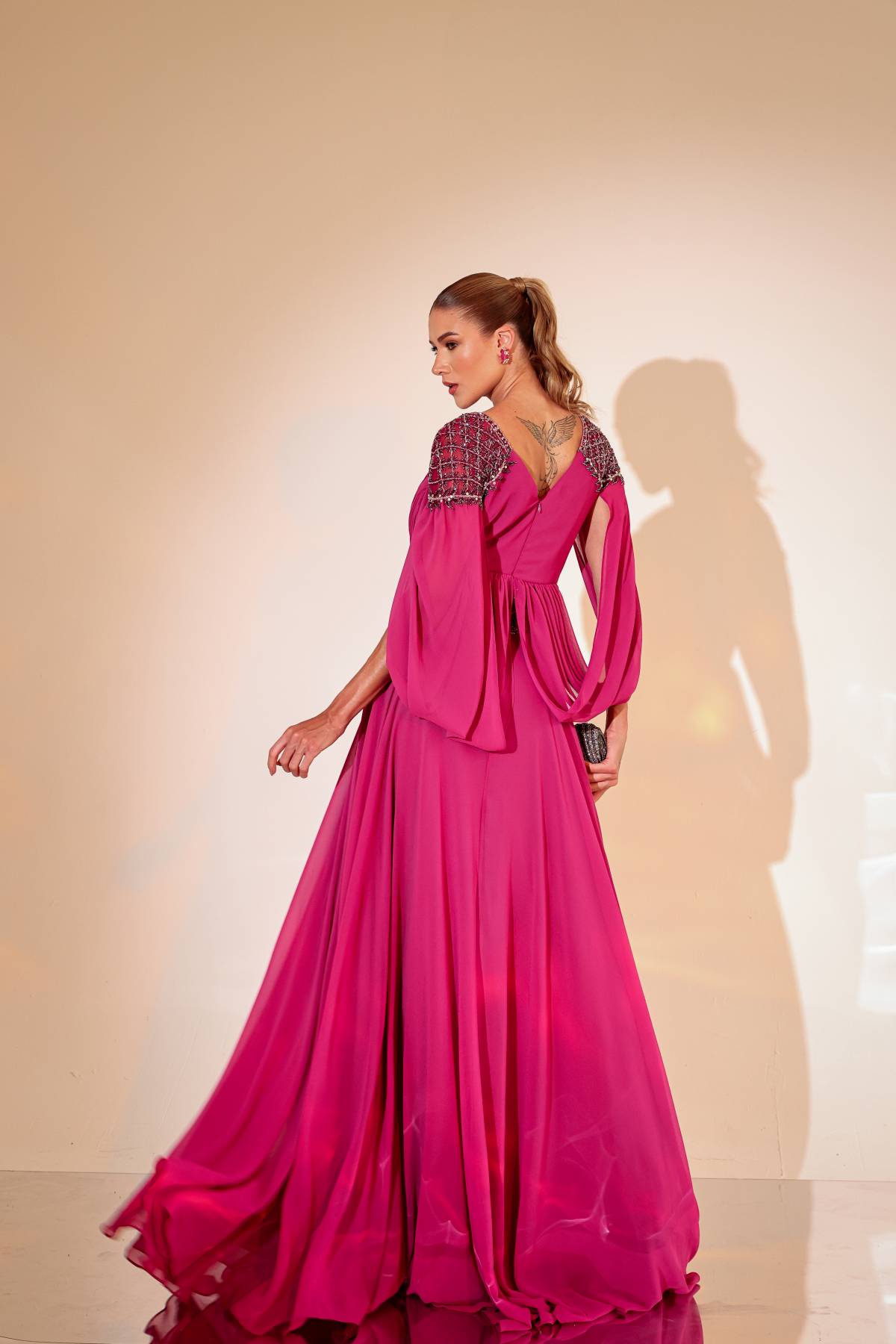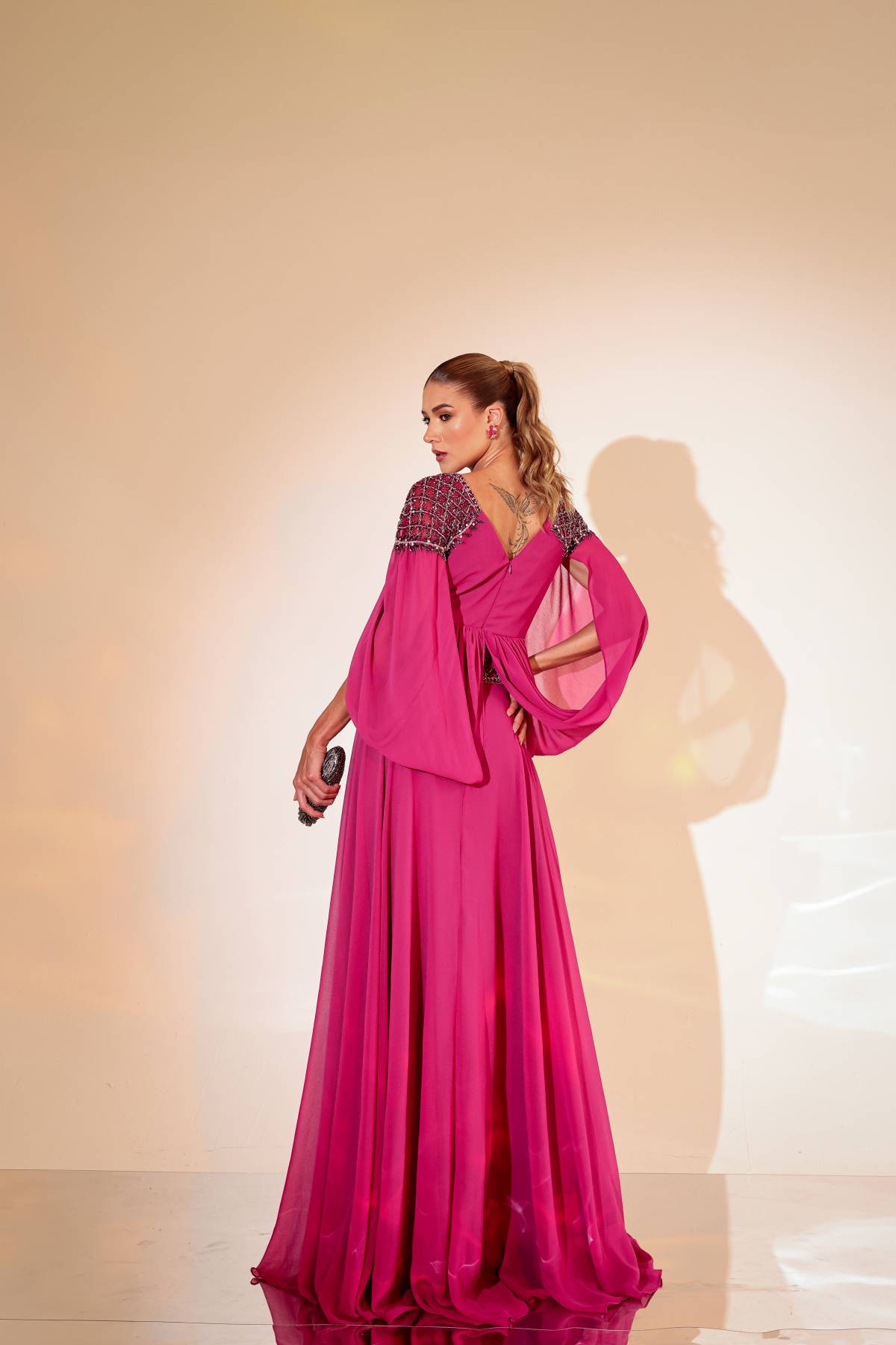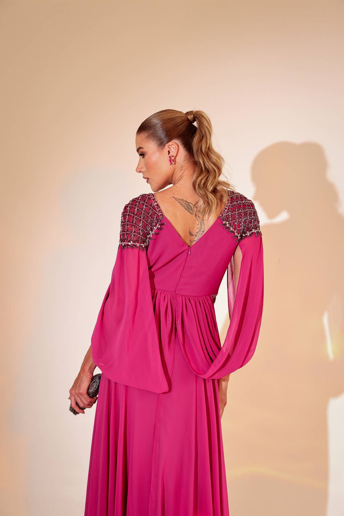 Vestido longo fucsia, manga capa, em seda.