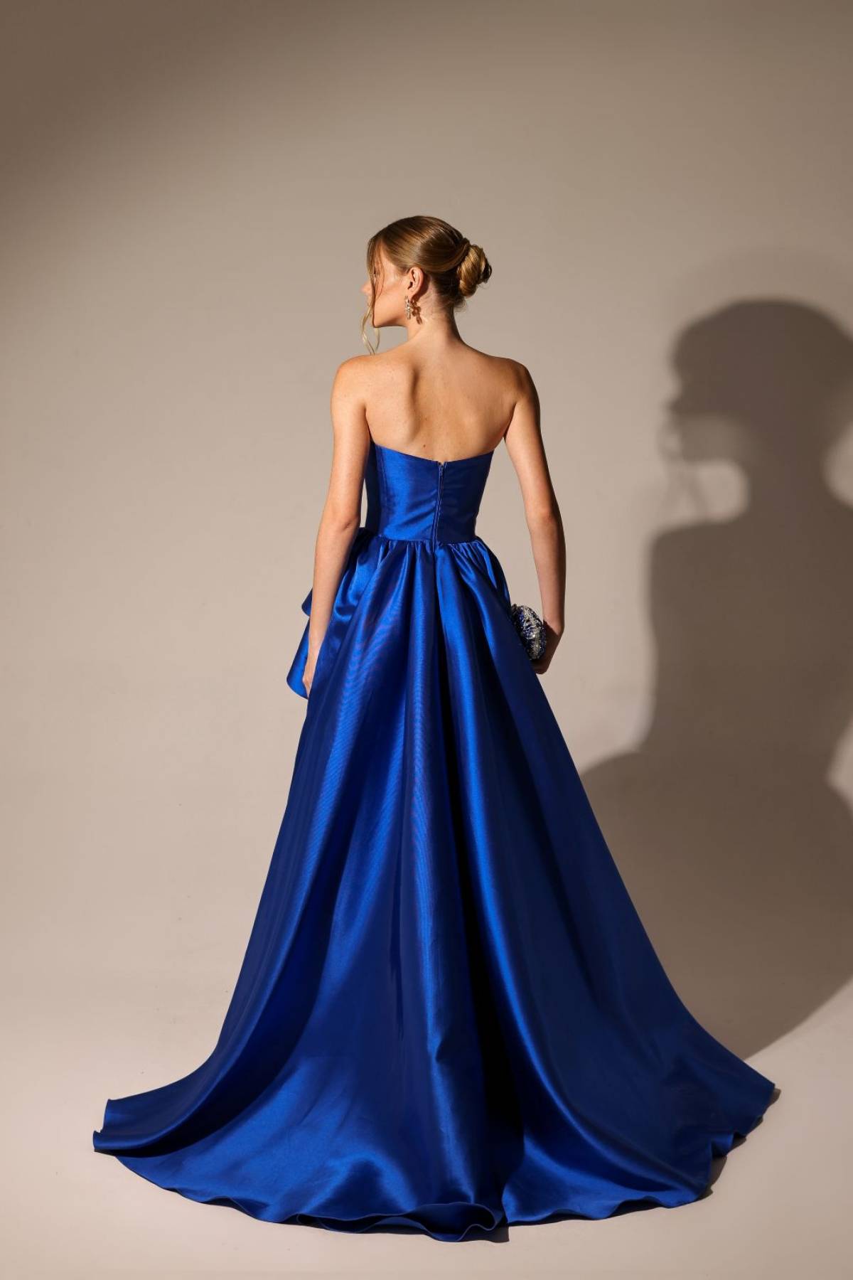 Descrição:Vestido azul carbono tomara que caia fenda, zibeline