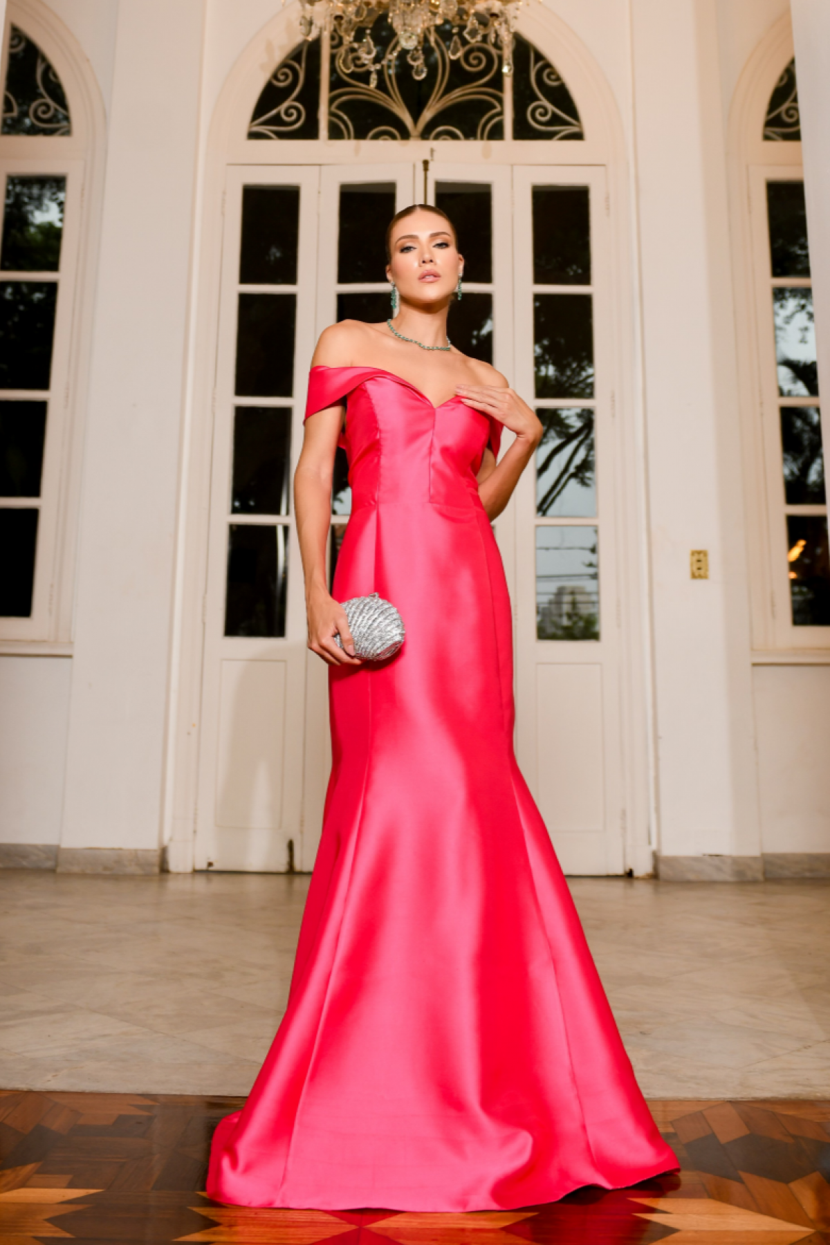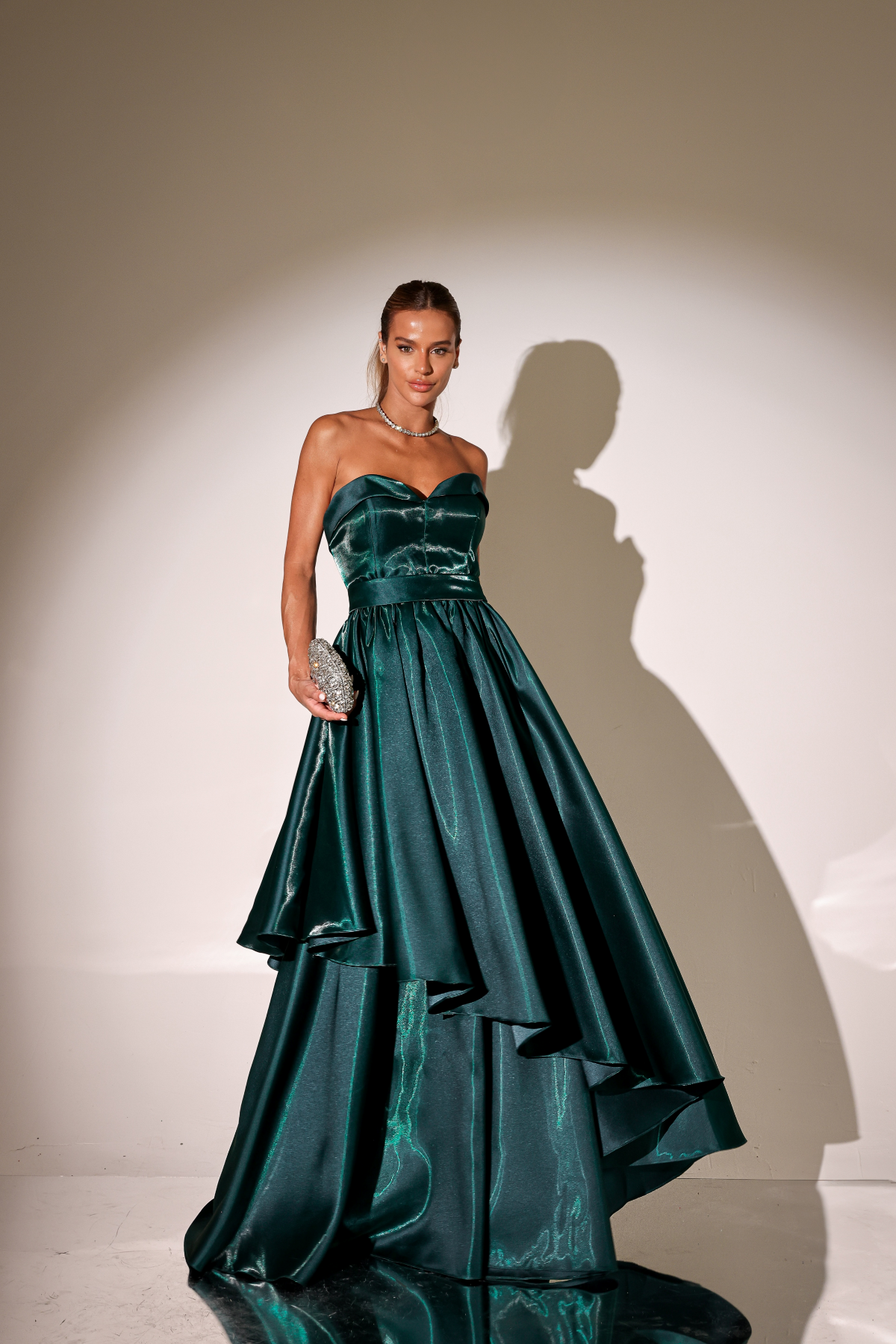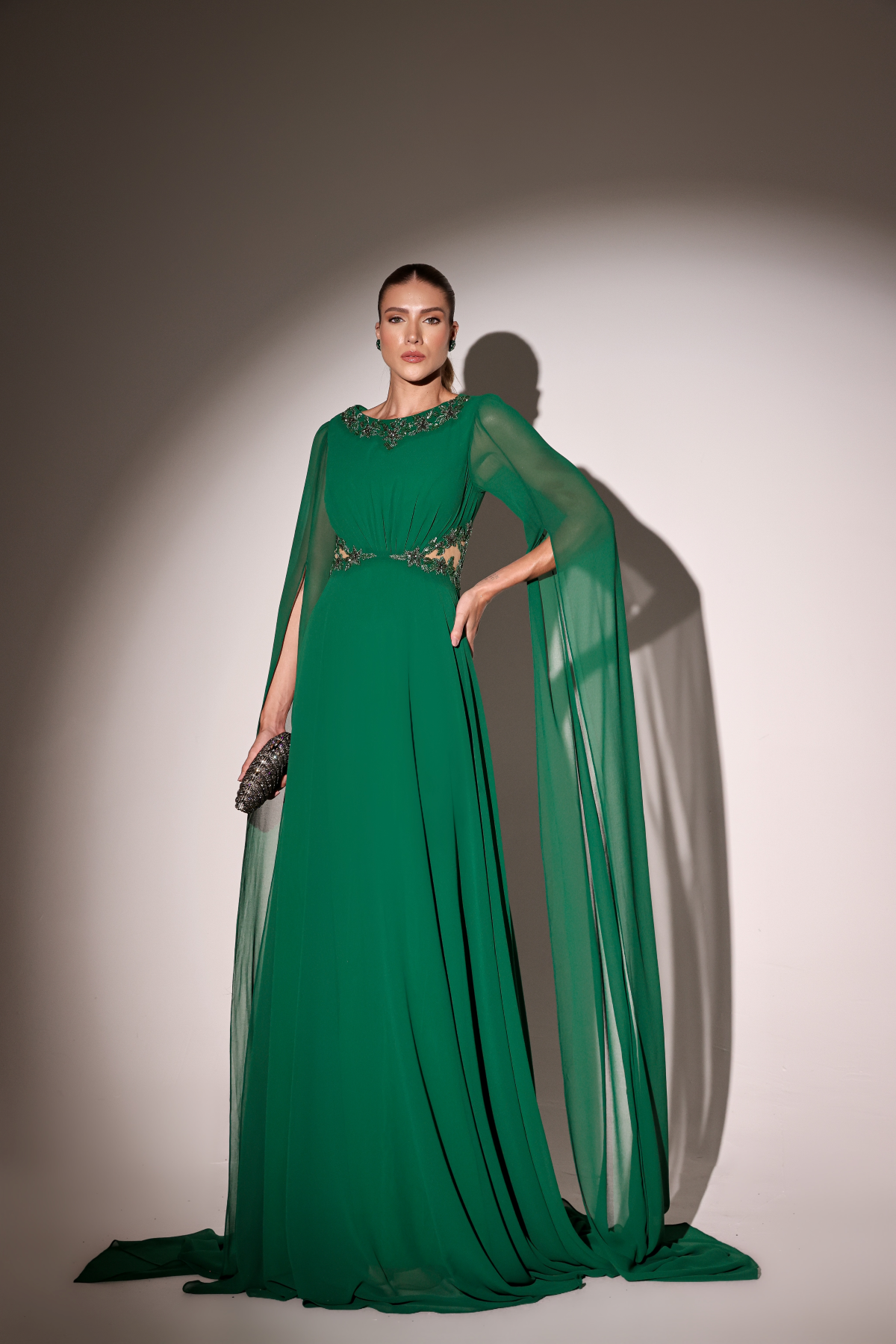 Vestido longo verde, com detalhes na cintura decote canoa, mangas capa.