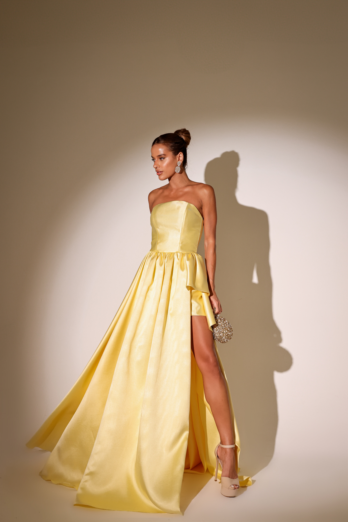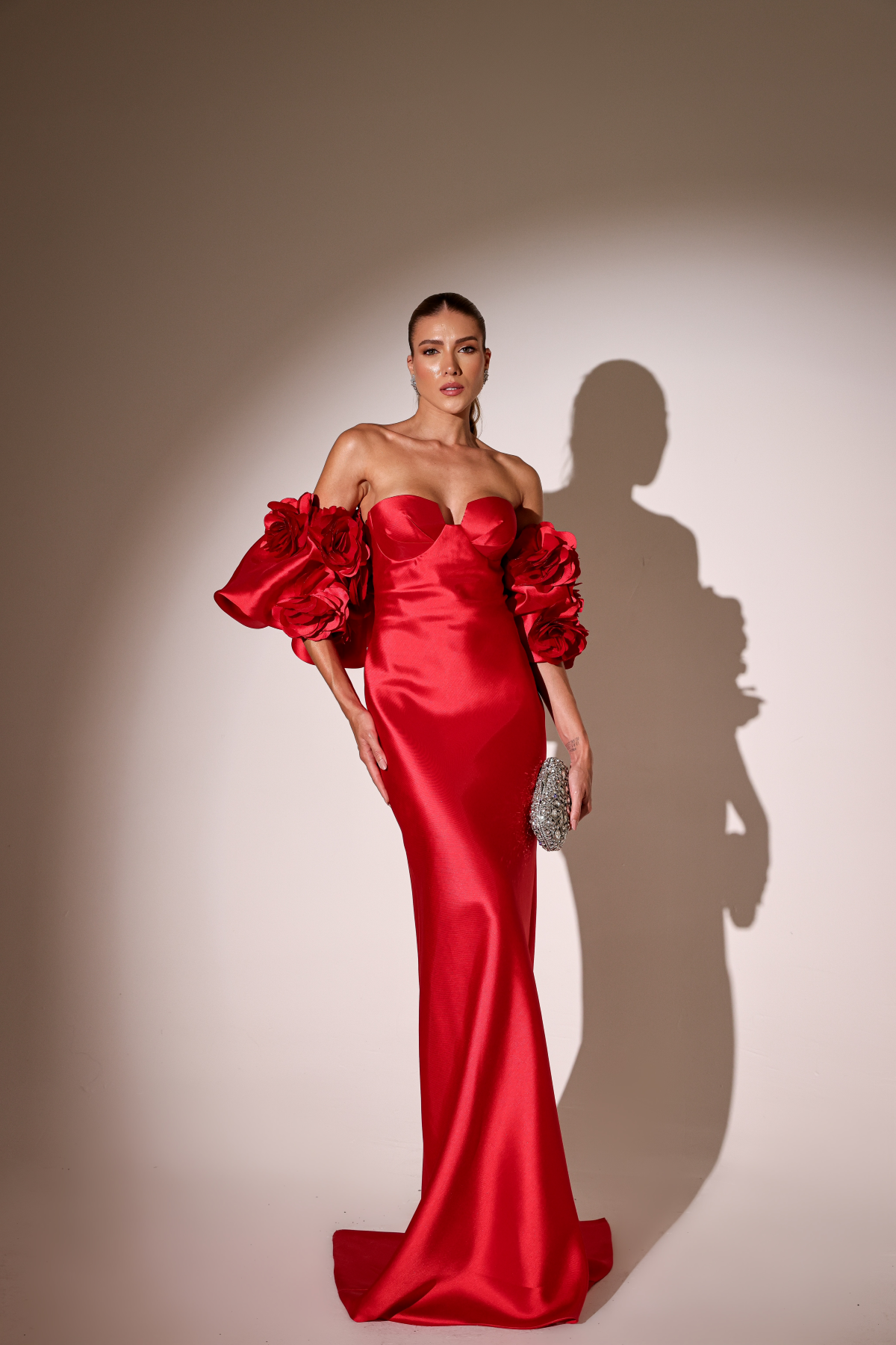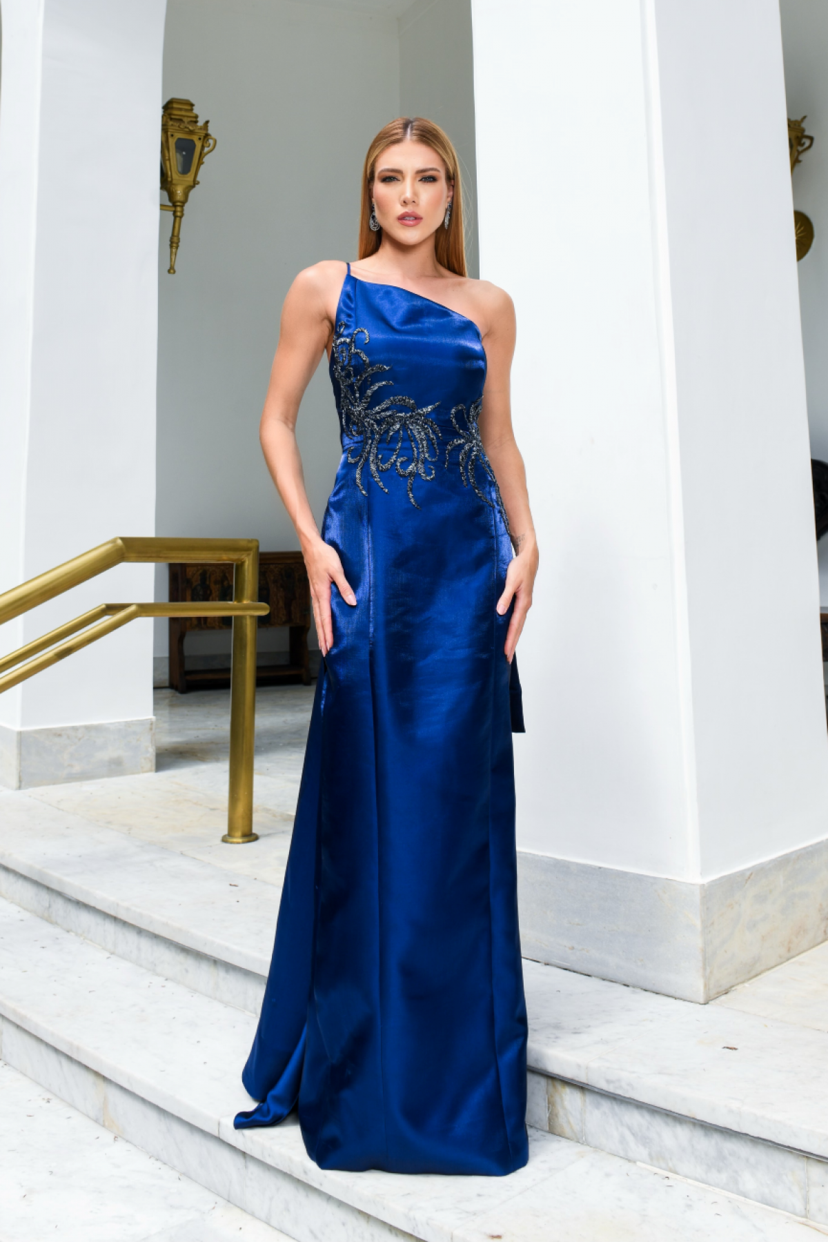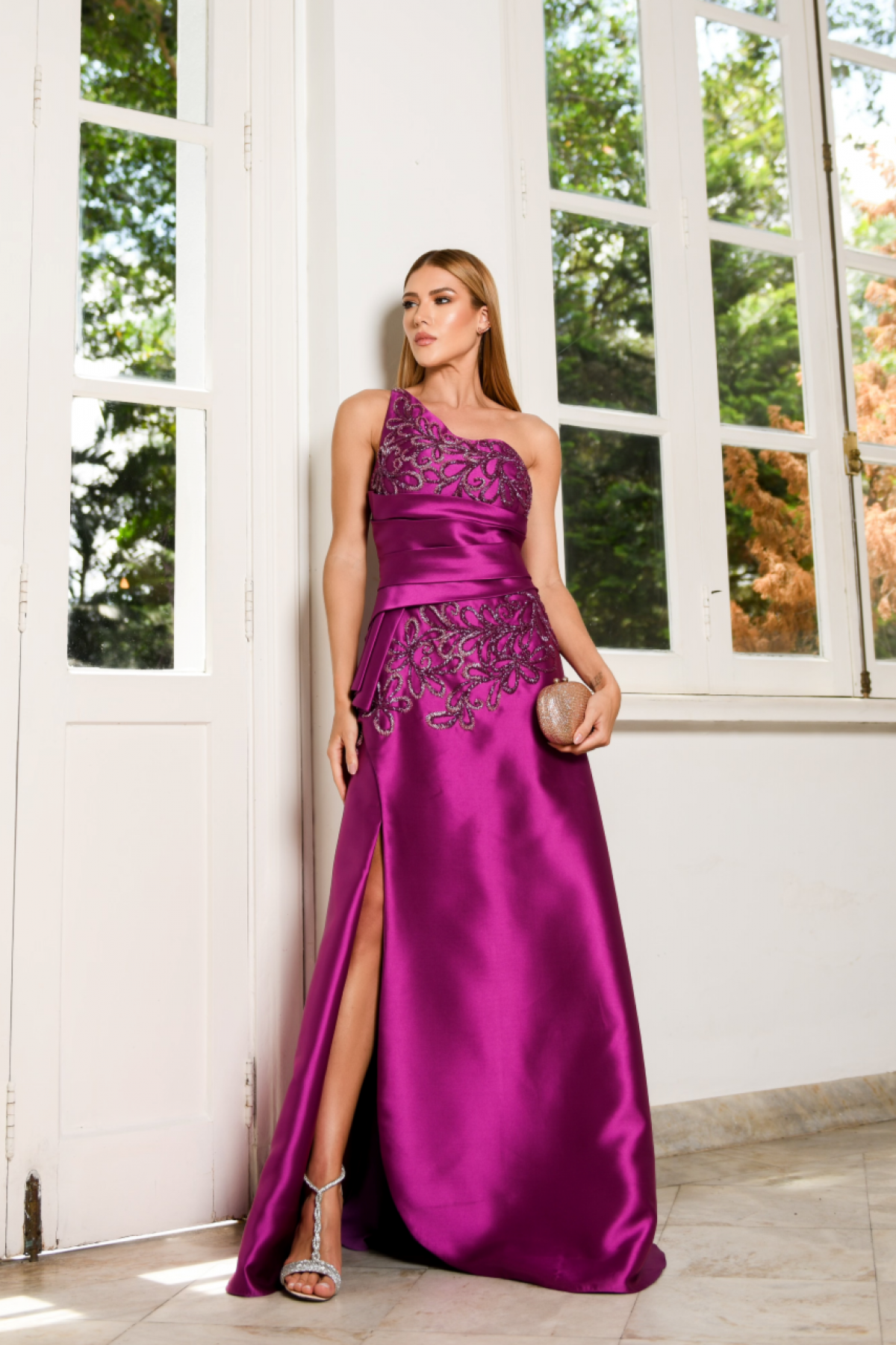 Vestido longo verde, com detalhes na cintura decote canoa, mangas capa.